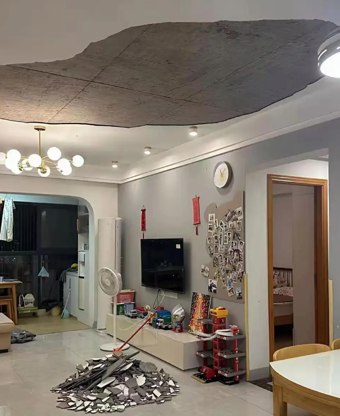 我家也掉了,但我不说是楼上的问题[抠鼻]装修的时候顶上没铲干净