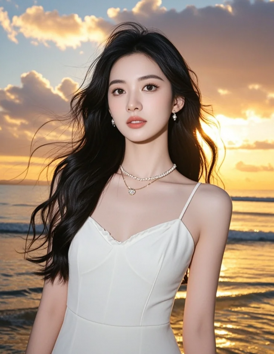 沙滩上的大明星,长发与晚风共舞,姿态优雅如诗行
