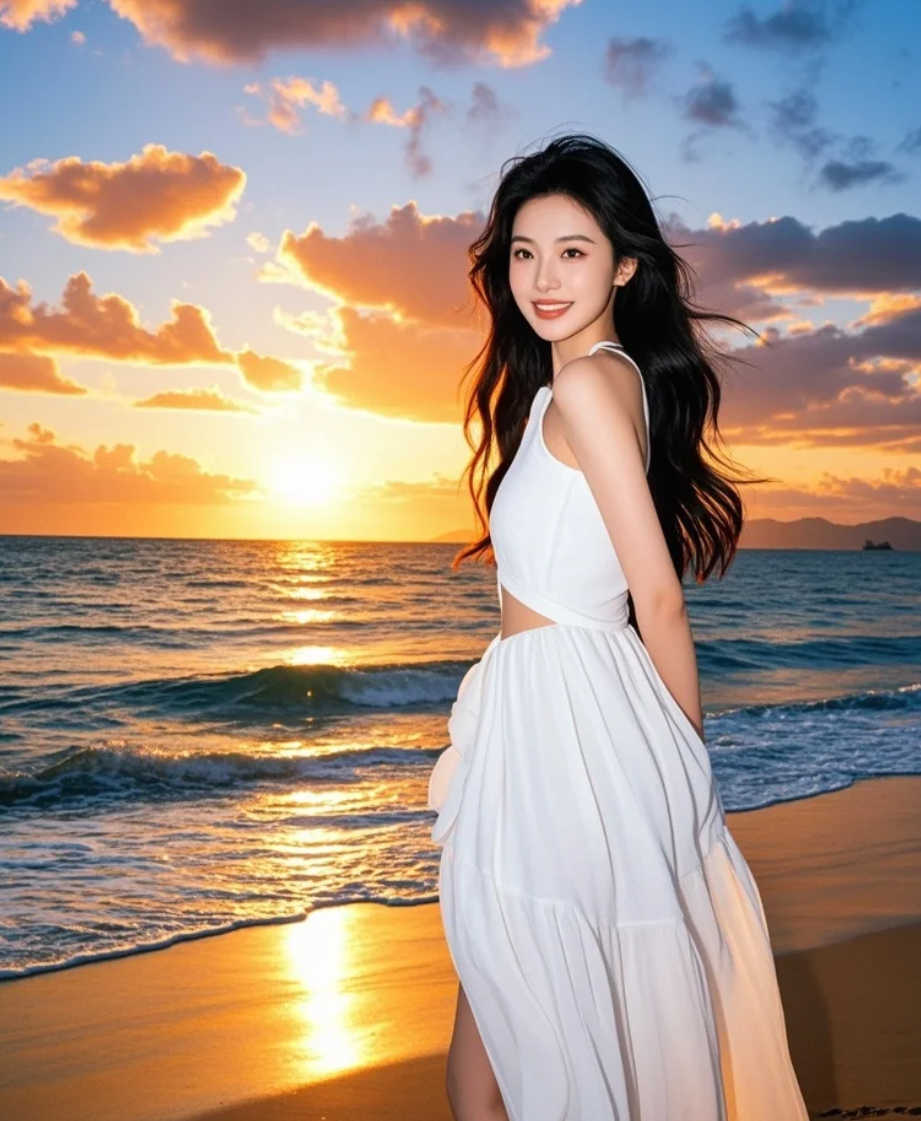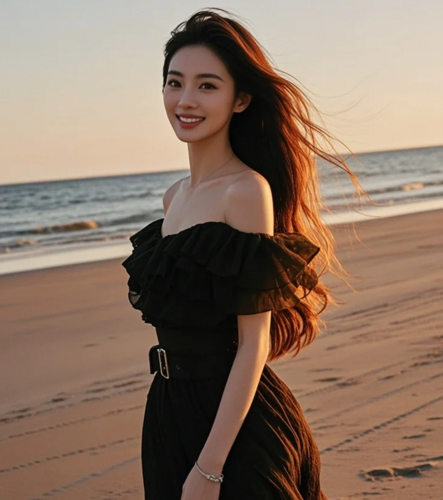 夕阳沙滩,她长发如瀑,回眸一笑,尽显大牌东方神韵