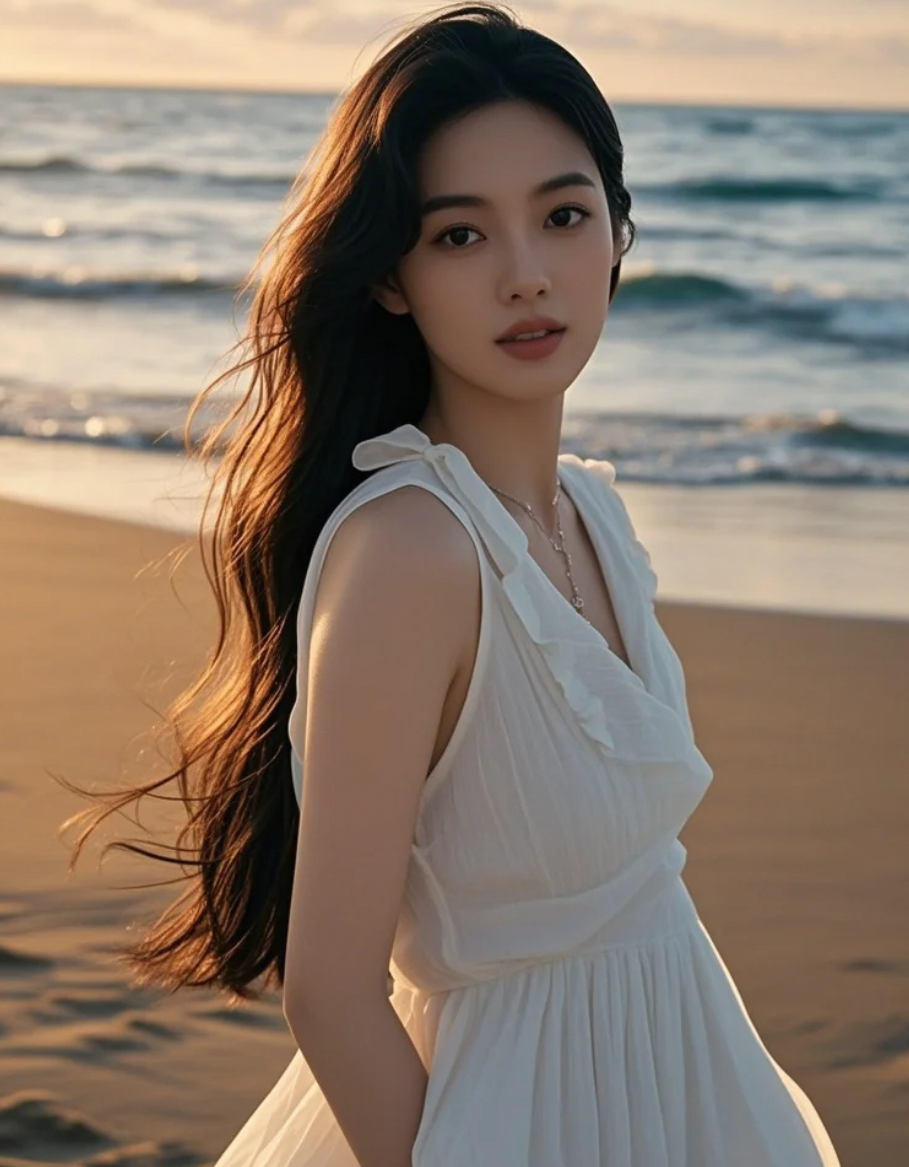 沙滩剪影中的大明星,长发飘飘,笑容如诗,神秘浪漫