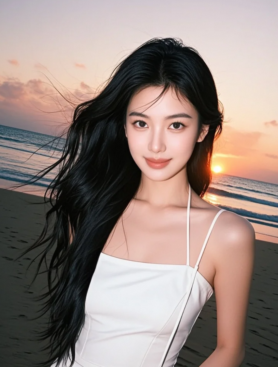 沙滩上的艺术女神,长发飘逸,笑容温柔,气场全开