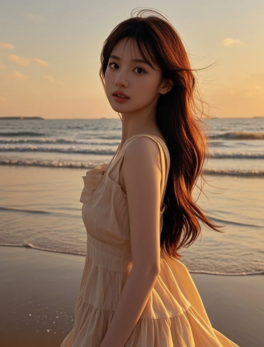 大牌气场在沙滩绽放,长发飞扬,笑容温柔如暖阳