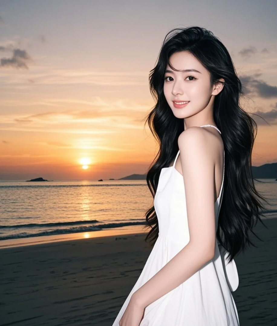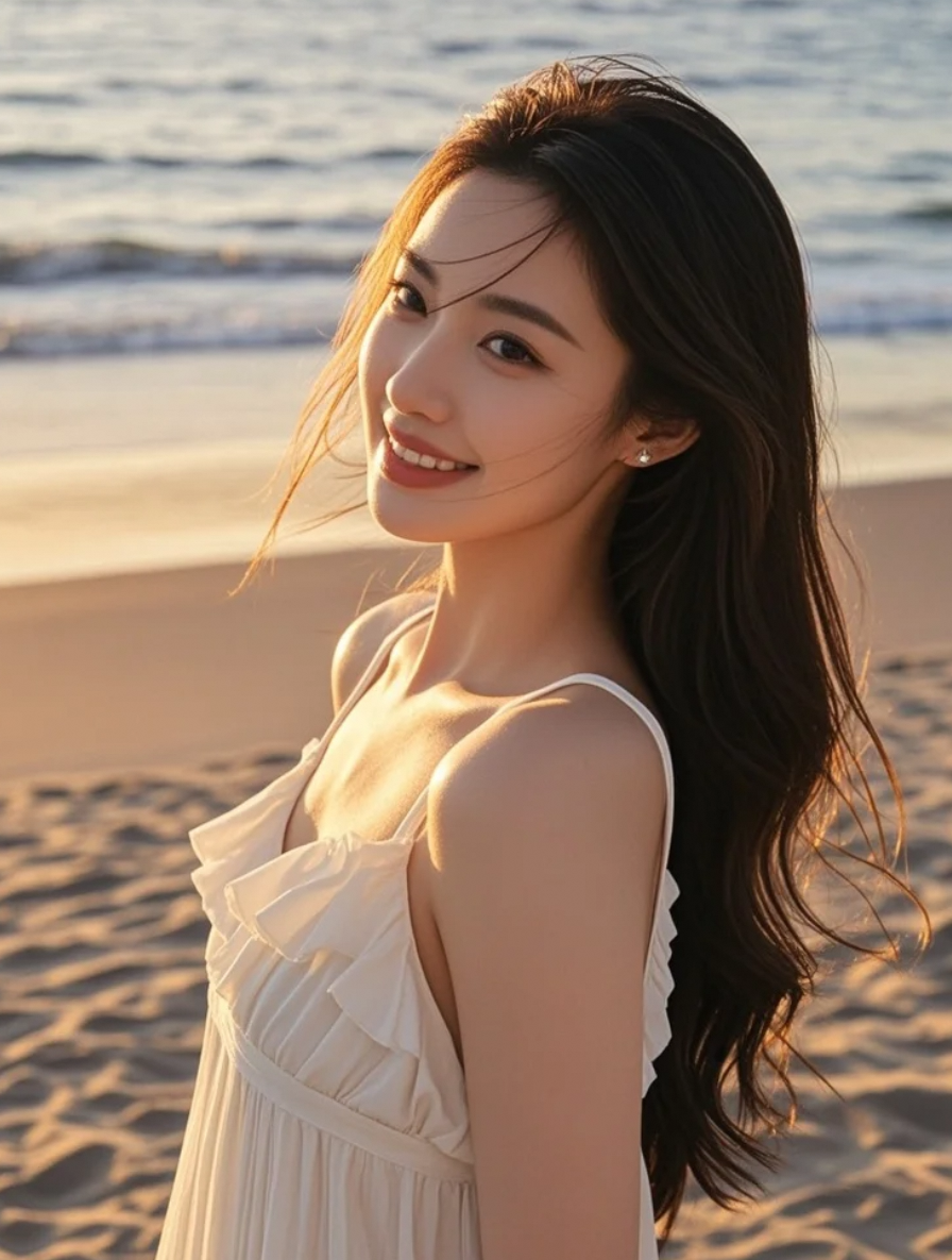 晚风中的沙滩倩影,长发与温柔笑容,巨星风范尽显