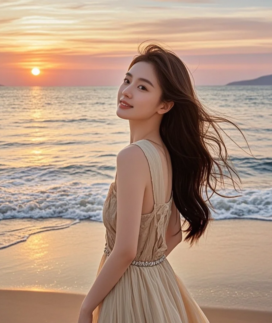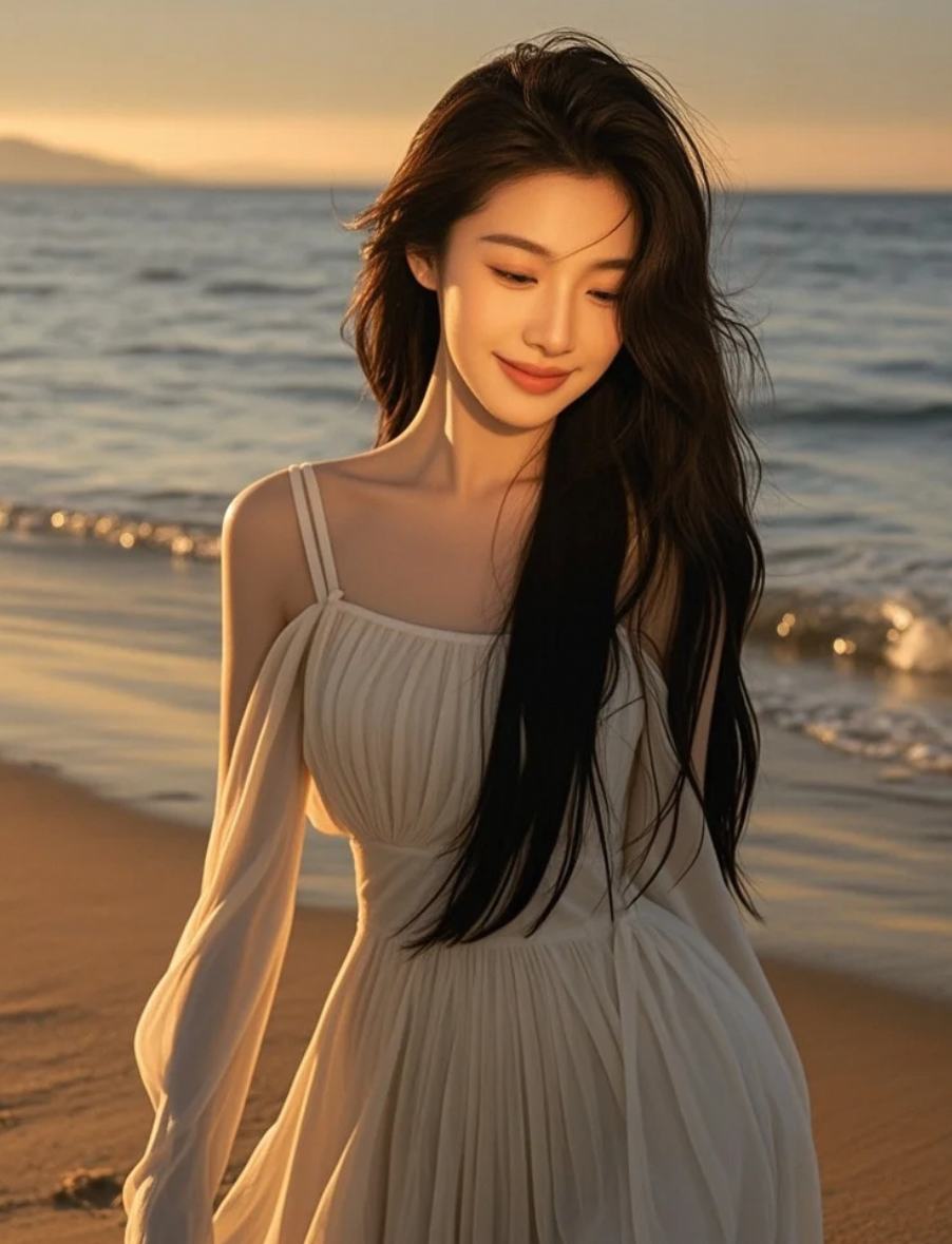 夕阳余晖里,她长发如云,笑容纯净,美得不食人间烟火