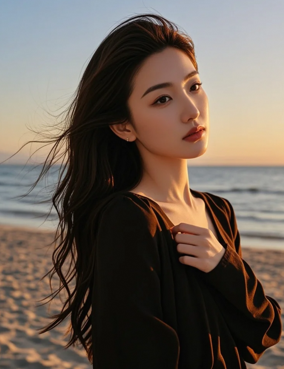 夕阳沙滩,她长发及腰,优雅转身,笑容如花绽放