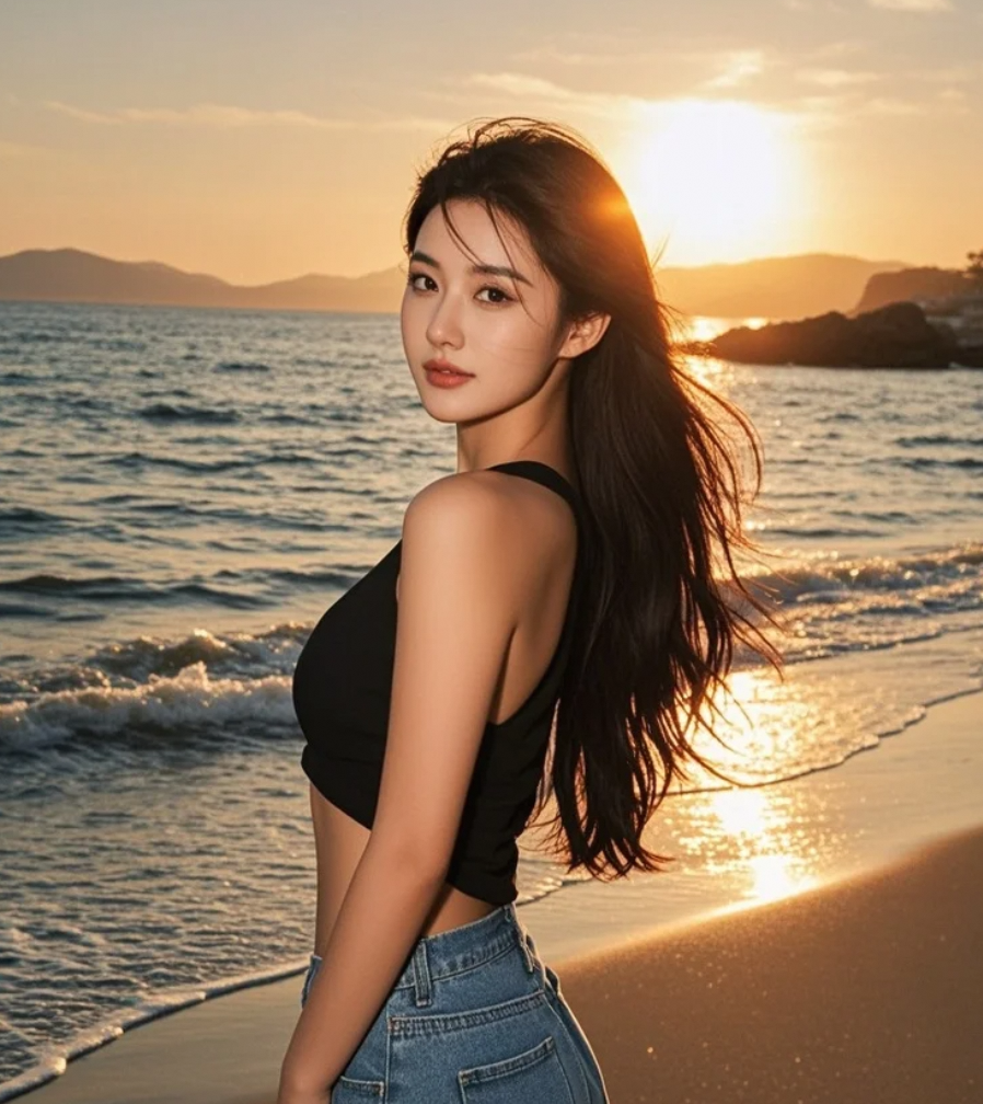 沙滩上的大明星,长发飘逸,笑容清新,姿态优美动人