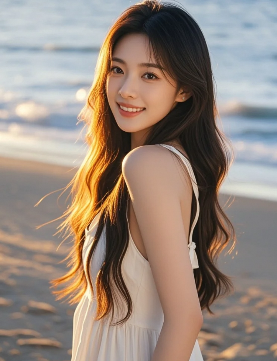 晚风轻送,沙滩上的长发女神,温柔笑意定格永恒