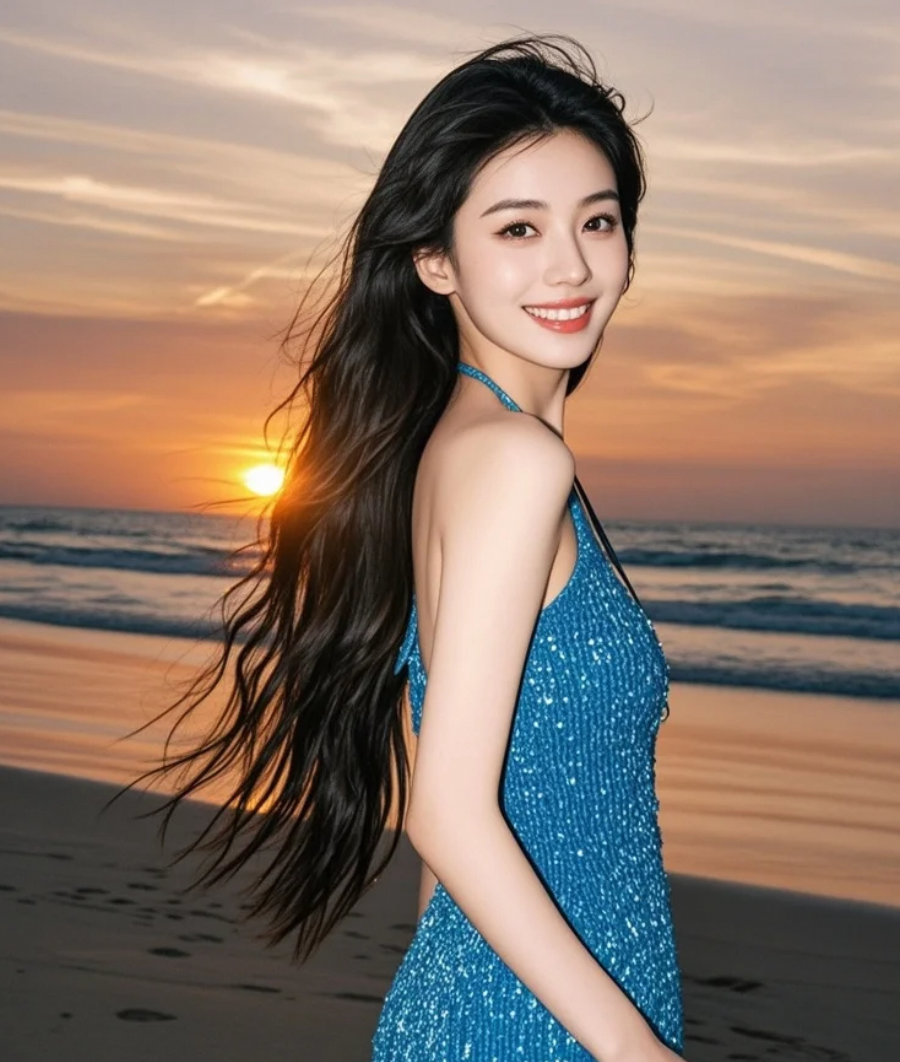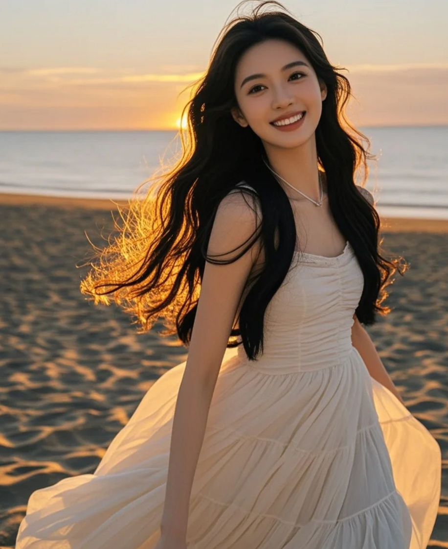 晚风中的沙滩倩影,长发飘散,笑容温柔,神秘浪漫