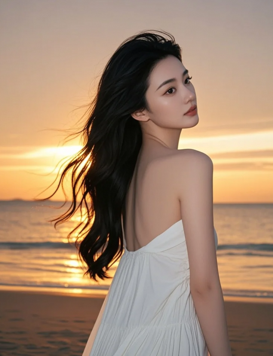 金色余晖中,长发女星优雅转身,笑容温柔如暖阳
