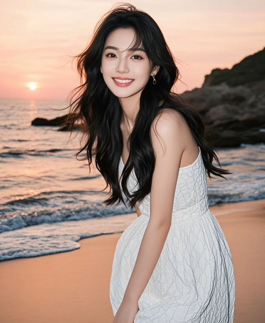 夕阳西下,大牌明星伫立海岸,长发飞扬,笑容宁静动人