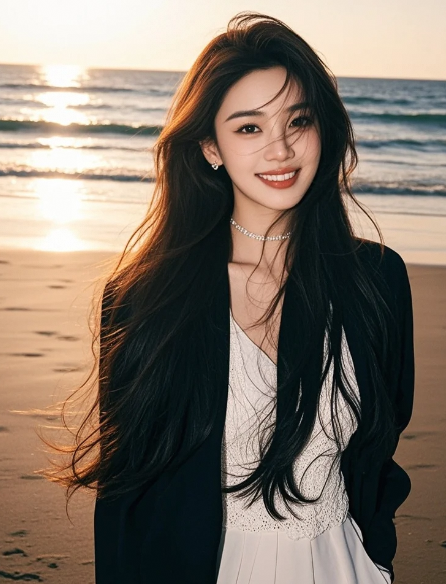 海风中的长发精灵,大牌明星的温柔笑容温暖了微凉暮色