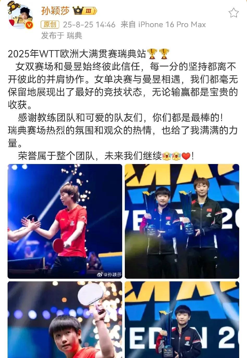 CoCo更新了社交平台,晒出他和莎莎的合影,还有瑞典的夕阳。看来,老太阳真的陪着小太阳一起去追夕阳了,真美好! 这次瑞典,大部分场外指导是马琳,CoCo都在看台上。生怕师徒俩有个生分,幸好啊,这么懂事又感恩的莎莎,怎么会忘记谁陪她走过来时路呢? 这次大赛奖杯的配色特别好看,莎莎一扛就扛了俩。她还发帖感谢曼昱和团队,得体又贴心。这次收获最大的就是莎莎了,积分,奖金,好心情。又努力又幸运的姑娘,我们下个赛场见![飞吻][飞吻] #孙颖莎# #邱贻可# #国乒# #邱贻可有多喜欢孙颖莎# #你喜欢孙颖莎吗# #瑞典大满贯# #你最喜欢孙颖莎的什么#