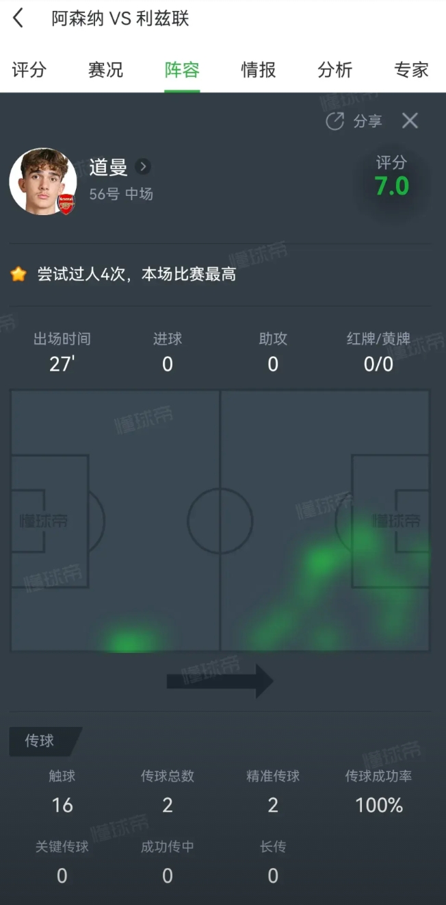 阿森纳未来帝星首秀非常惊艳!年仅15岁235天的的道曼成为英超历史上第二年轻出场的球员。不过与师兄恩瓦内里当年打酱油的首秀相比,道曼的首秀非常亮眼,不仅有全场最高的4次尝试过人,而且最后时刻还成功造点。如果顺利发展,未来与亚马尔绝代双骄的人很可能就是道曼!唯一担心就是道曼目前身高已经1米83,对于一名进攻型中场来说,身高如果超过1米9就有点高了,可能需要改位置。
