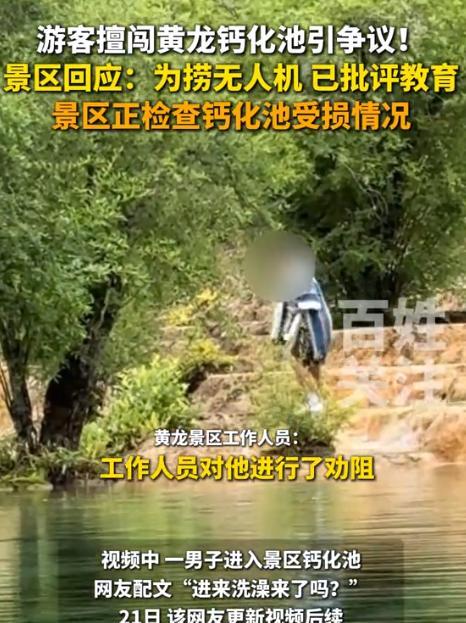“担心的事情还是发生了!”四川,黄龙景区,有游客发现,一名男子居然在景区著名的钙化池里蹚水,就像是在里面洗澡,看得人直摇头,这样做法未免也太不爱惜自然景观了。 据百姓关注8月22日报道,四川黄龙景区因为一段视频被推上了热搜。 视频里,一名男子直接走进著名的钙化池里蹚水,姿态轻松,好像在自己家浴缸泡脚一样。 周围游客看傻了眼,一个个都皱着眉头,忍不住摇头叹气。 要知道,黄龙景区可是大自然花了上万年才“雕刻”出来的宝贝,钙化池更是核心景点。 可惜,这位大哥完全无视景区规矩,径直下水,踩在那脆弱的钙华上。 游客们当场就有人出声制止:“这里是景区,不是你家院子,不能随便下去!” 也有人无奈摇头:“真是太缺德了,这么漂亮的地方禁不起这么折腾啊。” 大家都知道,钙华形成极其缓慢,一旦被踩坏几乎没法修复。 那一脚下去,毁掉的不只是景观,更是所有人对美景的珍惜。 事件曝光后,景区方面立刻介入调查。 原来,景区早就立了很多警示牌,明文禁止游客进入钙化池区域。 但这名男子不管不顾,硬是下水捞自己的无人机。 景区的工作人员表示对该男子进行了批评教育,肯定会受到处罚的,并且对工作人员也进行了批评教育和绩效扣罚。 网上的讨论也很激烈。 有人愤怒地说:“必须狠狠处罚,不然还会有人效仿。” 有人则建议:“景区应该加强巡逻和管理,看到苗头就要第一时间制止。” 还有人感叹:“旅游是享受风景,不是为所欲为,没素质的人毁的可不是一块石头,而是大家的共同财富。” 这类不文明行为早就不是第一次了。 有人在古迹上乱刻字,有人乱喂野生动物,还有人随手破坏文物,造成不可逆的损失。 每次都引来公愤,但类似情况还是屡屡发生。 像黄龙这样的自然奇观,是大自然千辛万苦才留下的珍宝。 我们每个人都只是过客,有义务保护,而不是去破坏。 只有大家共同守护,这份美丽才能代代相传。 对此你怎么看? 信源:百姓关注