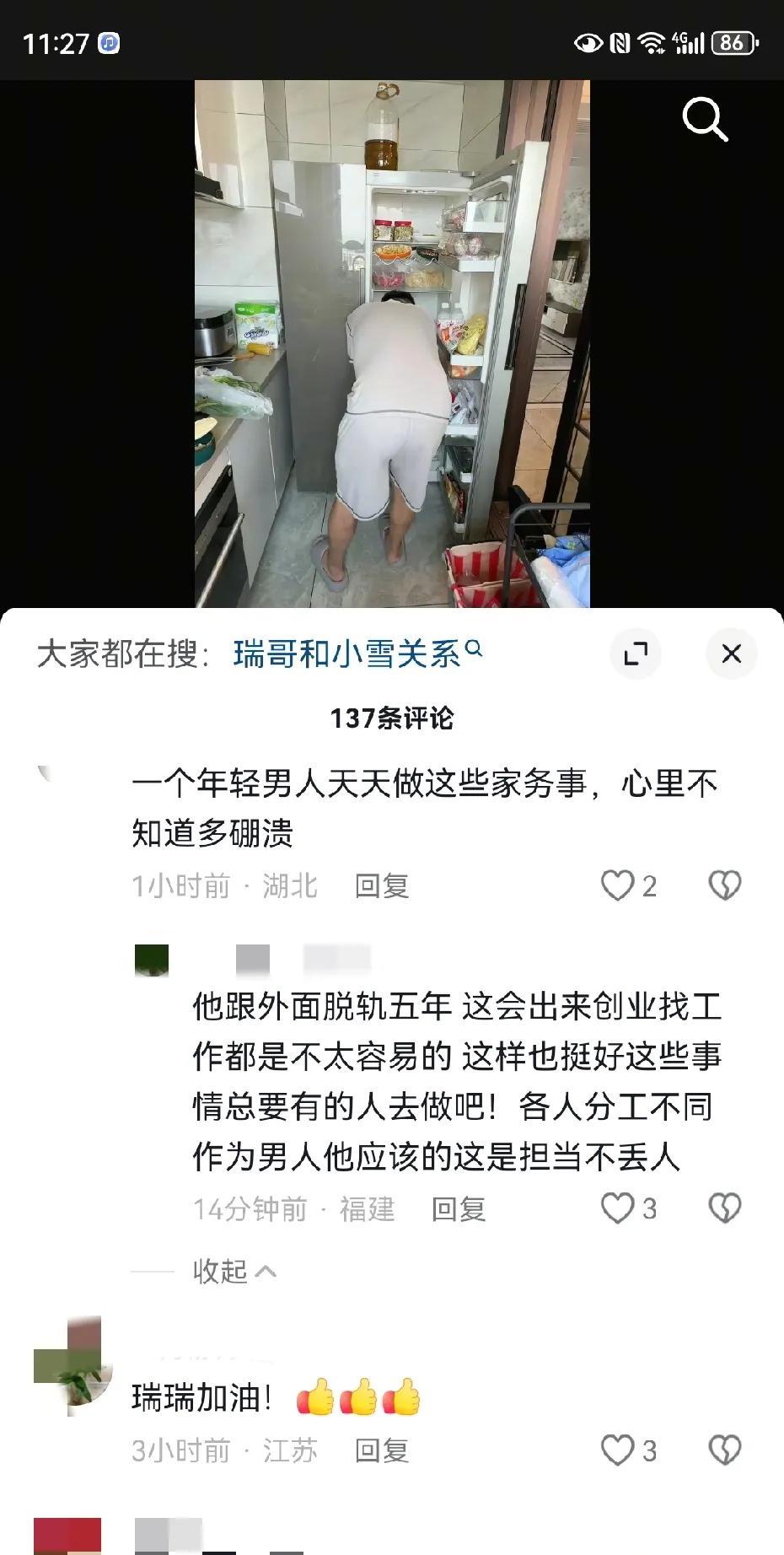 现在二姐家跟奶总家类似,都是男主内,女主外的模式。 二姐在广州跟姐妹打拼搞钱,瑞哥在家接替老母亲的职位,当家庭妇男。一家子的衣食住行都需要人打理,他们家还有两个随时尿床的孩子,床单被套洗来多得都没处晾。要做一家子吃的饭菜,连二姐自己睡的床都是她起来啥样就啥样,要等瑞哥去收拾。 如网友评论,他这个年龄过这种日子,一天两天,一月两月他可能可以坚持忍受。长此以往,经年累月的,女方完全不分担家务,只管赚钱是不现实的,他真的会有忍不住崩溃的一天,除非再请保姆。