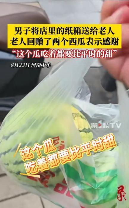 “活该他发财!”8月23日,河南郑州,一男子见有老人在店门口捡废品,老人礼貌询问废纸箱能不能捡,男子听后表示可以,并说店里面还有很多都送给他。老人听后开心坏了,说去借辆三轮车回来拉,没想到老人骑三轮车回来时,还提了2个西瓜送给男子!网友:骨子里的善良。 很多老年人没有收入来源,平日里只能捡些废品,生活过得非常不容易。 这天中午,夏日炎炎,张先生正在店内休息,忽然,他看到一位大爷停下电动车,捡拾着门口的废纸箱。 大爷也看到了张先生,就礼貌的问了问能不能捡,刘先生欣然同意,表示屋内还有很多也都送给他,老人听后非常开心,一下子捡到这么多废纸箱,自己的电动车带不了,他就打算借个三轮车回来拉。 过了一会儿,大爷骑着三轮车回来了,还特地买了两个大西瓜送给张先生。 张先生本不想要,可奈何大爷实在太坚持,他最终只能收下,感慨道:这个瓜吃着肯定要比平时的甜! 网友看后表示,双方都是善良的人,虽然这些废纸箱对于店主来说并不值钱,但在老人眼里却是“宝贝”,而老人也没有白拿,还送来两个西瓜,这个举动可不是一般人能做到的! 信息来源:《“这个瓜吃着都要比平时的甜!”男子将店里的纸箱送给老人,老人回赠了两个西瓜表示感谢。》第1眼新闻