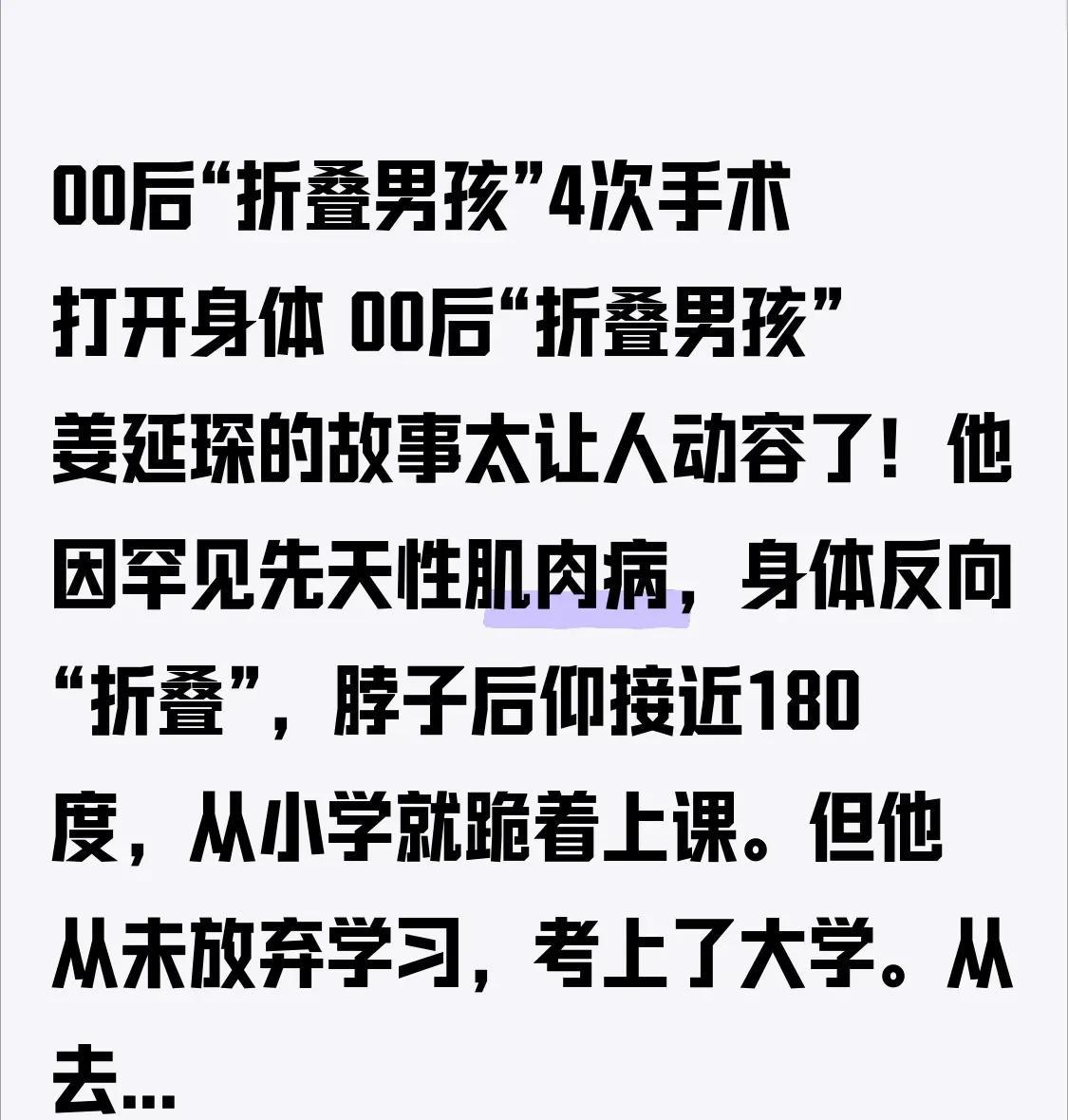 00后“折叠男孩”4次手术打开身体00后“折叠男孩”姜延琛的故事,实在是令人动