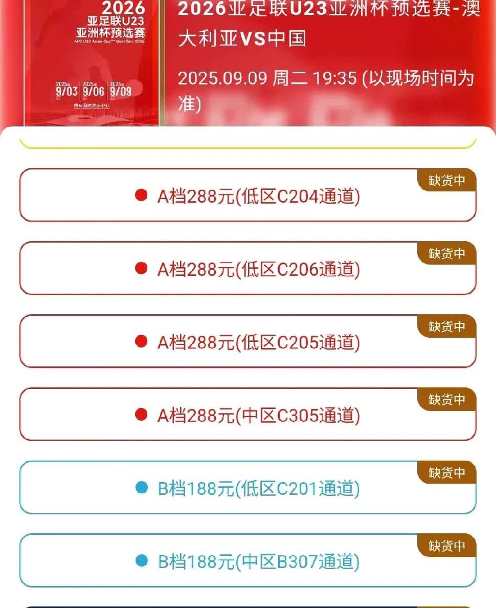 U23球票,中国队:澳大利亚队, 不到十分钟,球票售罄。 9月9号19点35