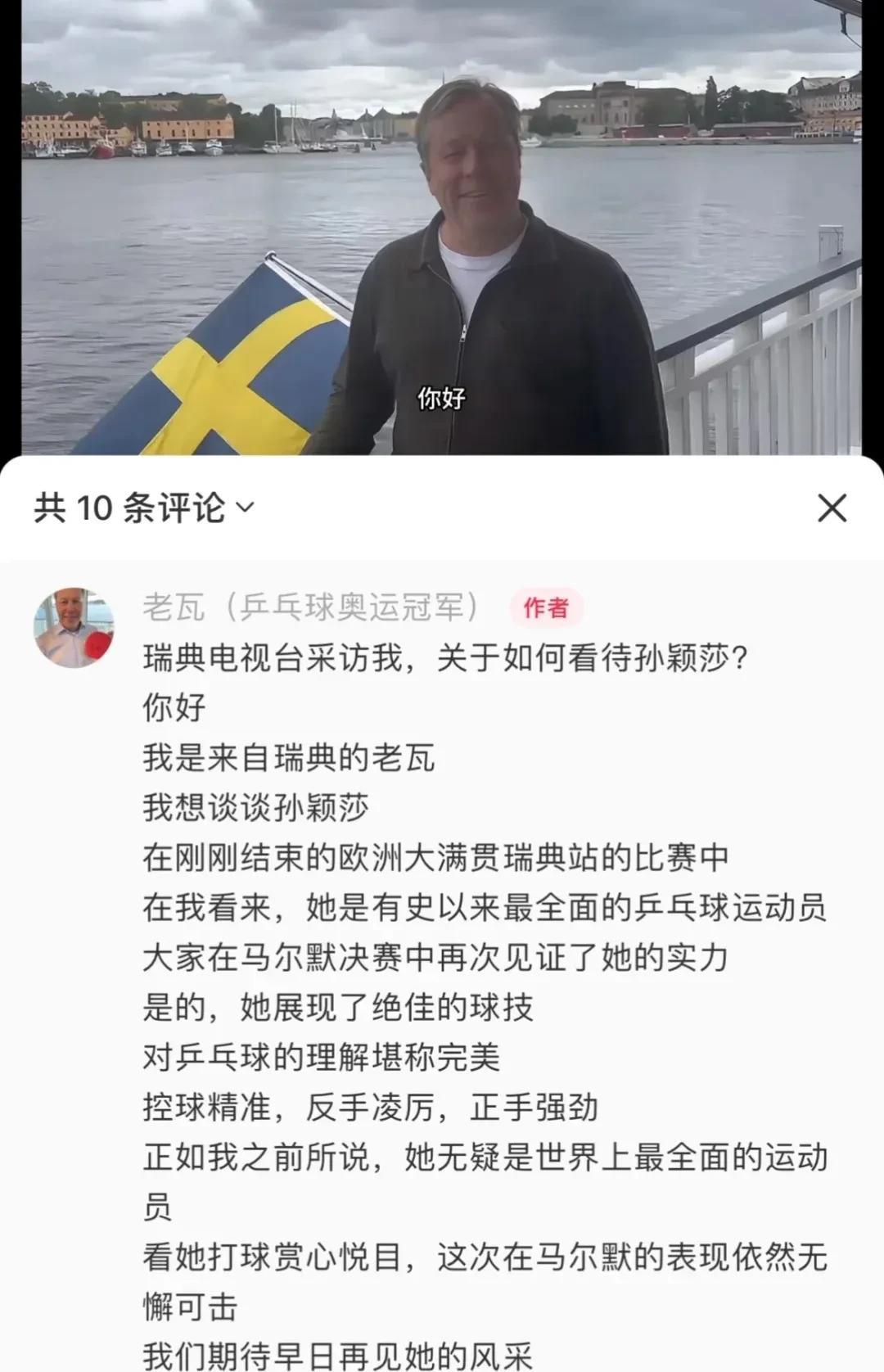 孙颖莎得到瓦尔德内尔的认可,称赞她是最全面的运动员,对球的理解很到位,是史上最有