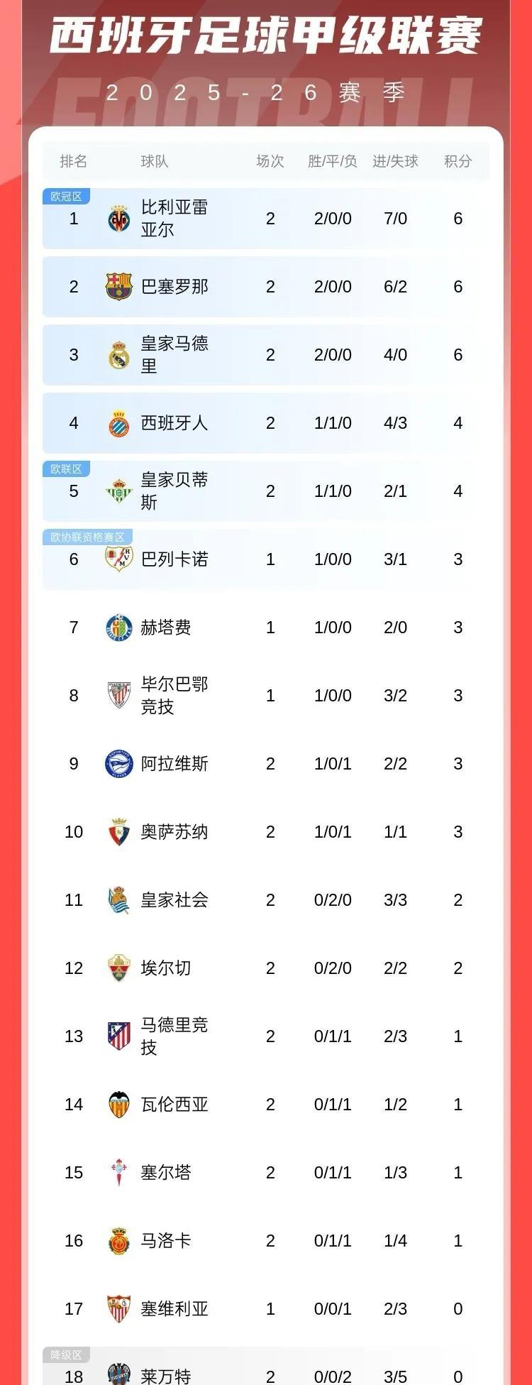 五大联赛第二周 随着利物浦第100分钟绝杀纽卡,五大联赛第二周的比赛全部结束,来看下具体赛果和排名情况! 英超目前仅有三支球队收获两连胜,分别是打进6球0丢球的阿森纳、打进5球0丢球的热刺和两战丢4球的利物浦,传统BIG6中只有曼联没能赢球,两战一平一负排名第16! 西甲第二轮过后,皇马、巴萨、比利亚雷亚尔、毕尔巴鄂竞技以及赫塔菲五支球队两连胜排名前五,其中比利亚雷亚尔两战打进7球0丢球领跑积分榜,马德里竞技一平一负排名第13! 法甲大巴黎用两轮经济实惠的1-0收获两连胜,里昂、图卢兹暂时以净胜球优势排在前两位,切尔西小弟斯特拉斯堡排名第四! 德甲首轮冷门频出,大黄蜂3分钟丢两球客场3-3被圣保利逼平,滕哈赫德甲首战药厂1-2主场不敌霍芬海姆,拜仁和法兰克福稳定输出,纷纷大胜各自对手! 意甲首轮米兰、博洛尼亚、拉齐奥、亚特兰大纷纷遭遇滑铁卢、非平即负,国米5-0大胜领跑积分榜,尤文、那不勒斯、罗马则收获赛季开门红!