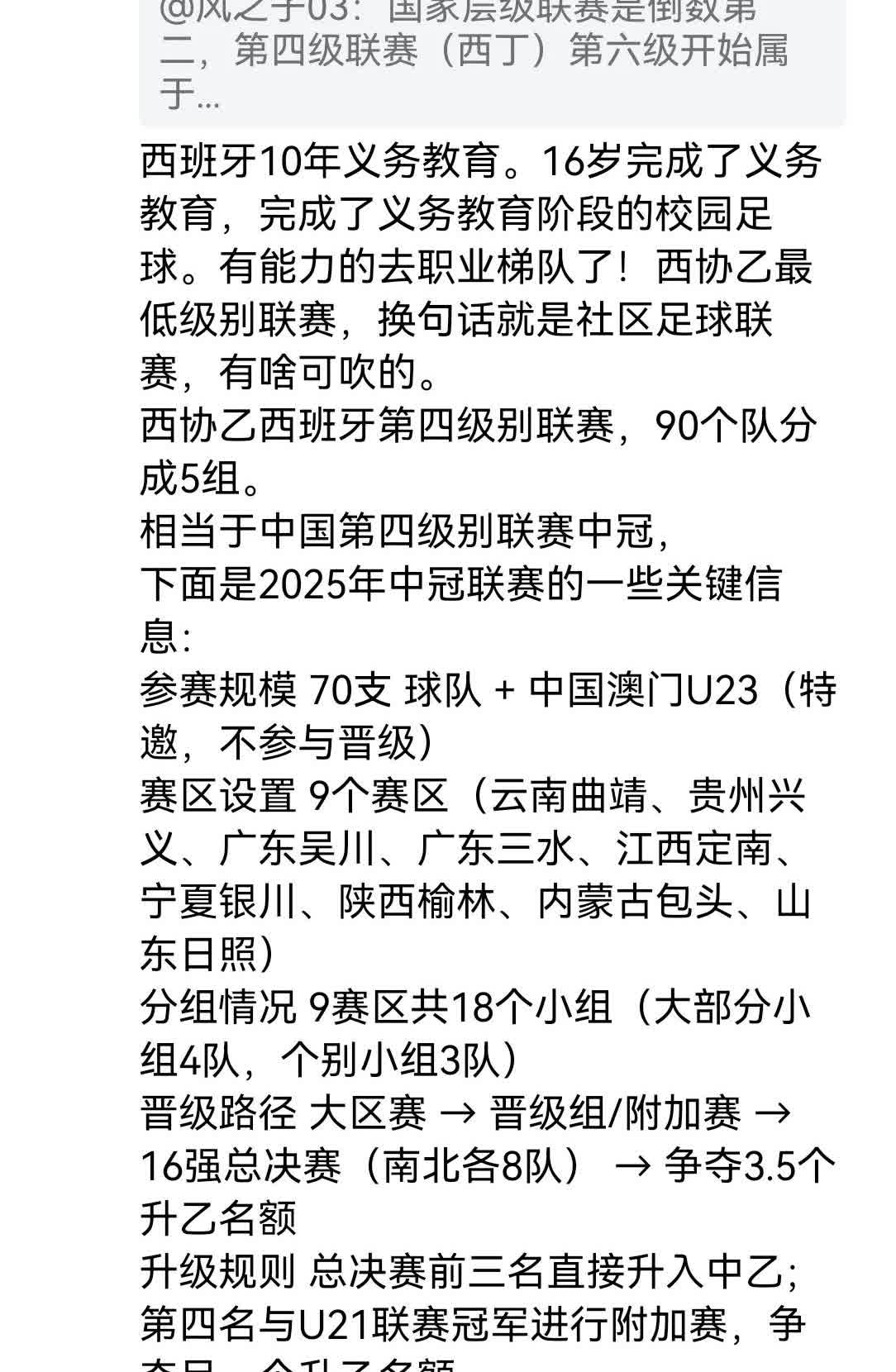 根据事实:西协乙是西班牙第四级别联赛,中冠是中国第四级别联赛,相似的是,西协乙是半职业,中冠到大区赛的级别,有的球队也是半职业性质。西甲是西班牙顶级联赛,职业联赛,中超是中国顶级联赛,职业联赛。 按照类比方法,图二这位踢球孩子的家长所说:西协乙=中冠(社区联赛),西甲=中超,这似乎也没有什么毛病,只要别加入什么国家队排名、联赛排名、球星数量、球队的成长性等等这些看不懂的东西。 是不是有一种说法,西甲,号称“欧洲小中超”? 我渐渐有了一个观点,并非所有踢球孩子的家长,都有很大的格局。并不是所有踢球孩子的家长,能相互理解在中国踢球冲击职业队不容易,能够实事求是,为身边其他取得阶段性成功的孩子鼓掌,至少承认他人的优秀。他们中的有些人(欢迎对号入座),是会为别的孩子的优秀而难受,去期望和诅咒他人失败。 当然,也一定有踢球孩子的家长,为身边的孩子,甚至自己孩子的对手的优秀而鼓掌(比如图三这位,恒大足校12的周章杰的家长),因为优秀的人,会是自己孩子努力追赶的榜样👍