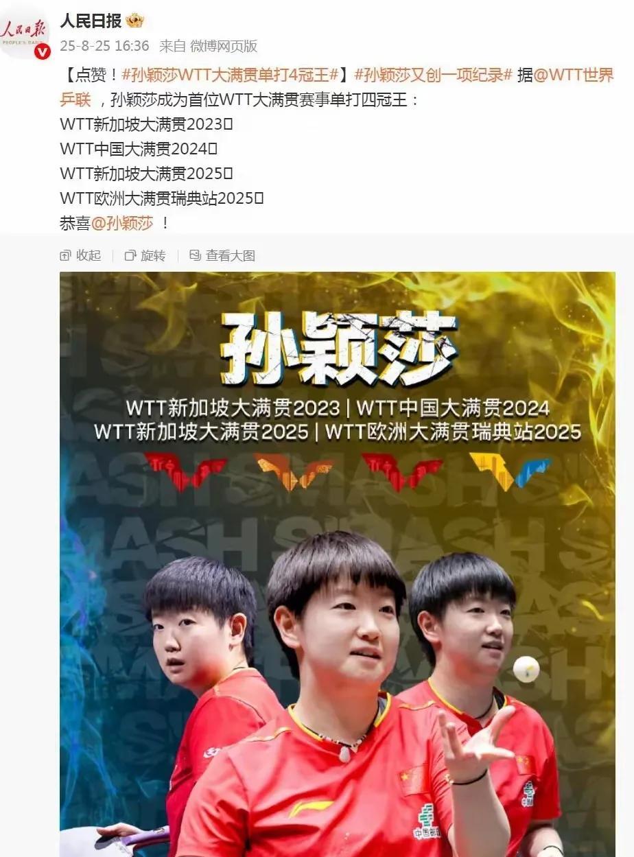 央妈真是心细如发啊, 从不吝啬对莎莎的夸夸! 瑞典大满贯女单冠军, 对莎莎而言意义非凡, 第四座大满贯赛冠军! 对其他运动员而言, 一个冠军都难于上青天, 在已经举办的八次大满贯中, 莎莎已经拿到四座女单冠军, 她真的做到了别人做不到的! 一个莎莎拿到一半冠军, 其他选手加起来拿另一半, 这样的“万分女王”, 值得央妈各种夸夸各种宠溺! 大满贯不同于一般WTT赛事, 积分跟奥运会、世锦赛相同, 冠军都是2000积分, 奖金也高到让人开心。 莎莎的四个大满贯女单冠军: 2023年WTT 新加坡大满贯, 2024年WTT 中国大满贯, 2025年WTT 新加坡大满贯, 2025年WTT 欧洲大满贯瑞典站。