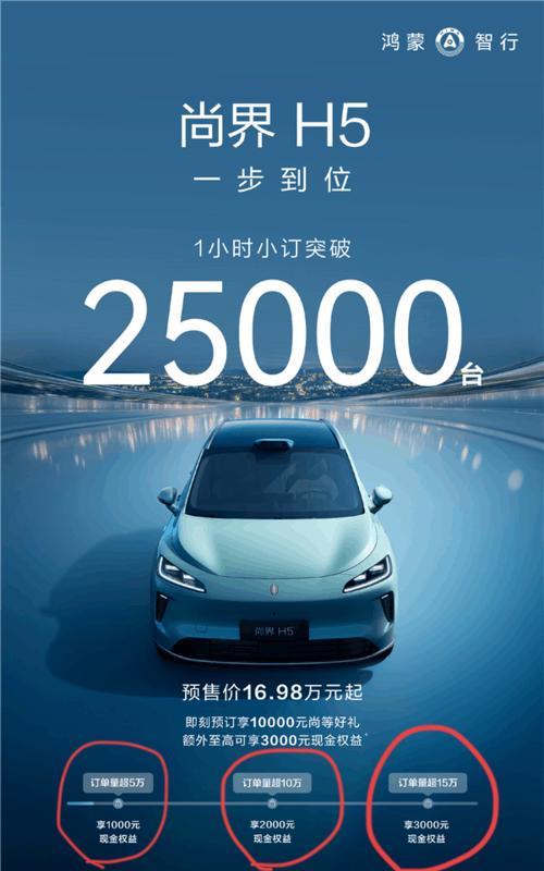 鸿蒙智行这是要一统中高端新能源汽车江湖了吗? 昨日,华为的汽车五界算是正式集齐,最小的尚界将首款新车(B级SUV)H5价格直接瞄向了最火热的10-20万价格区间,一小时小订就破25000台。有望超越问界成为五界里销量最好的一届,毕竟尚界主打“亲民走量”路线,十几万的H5就能拥有纯正的华为先进智能汽车技术,确实对其它同价位车来说属于“降维打击”。 此外上汽为了把H5捧成将来的销量支柱,不光预售价给力,有万元大礼包相赠,还会根据订单量的多少给下订车主最高3000元的现金权益。 同样对华为抱有特别期待的奇瑞董事长更是宣布:未来奇瑞集团所有资源都向智界倾斜,所有的产品线品牌,都要为智界让道。 至此,尚界主打10-20万的亲民走量路线;智界主打20-30万的年轻运动路线;享界主打30-40万的豪华行政路线;尊界主打超70万+的超豪华旗舰;问界则作为“嫡亲血脉”,享受特例,虽主打家用SUV,但20-60万价格区间都有布局,也是目前鸿蒙智行产品里的销量霸主!