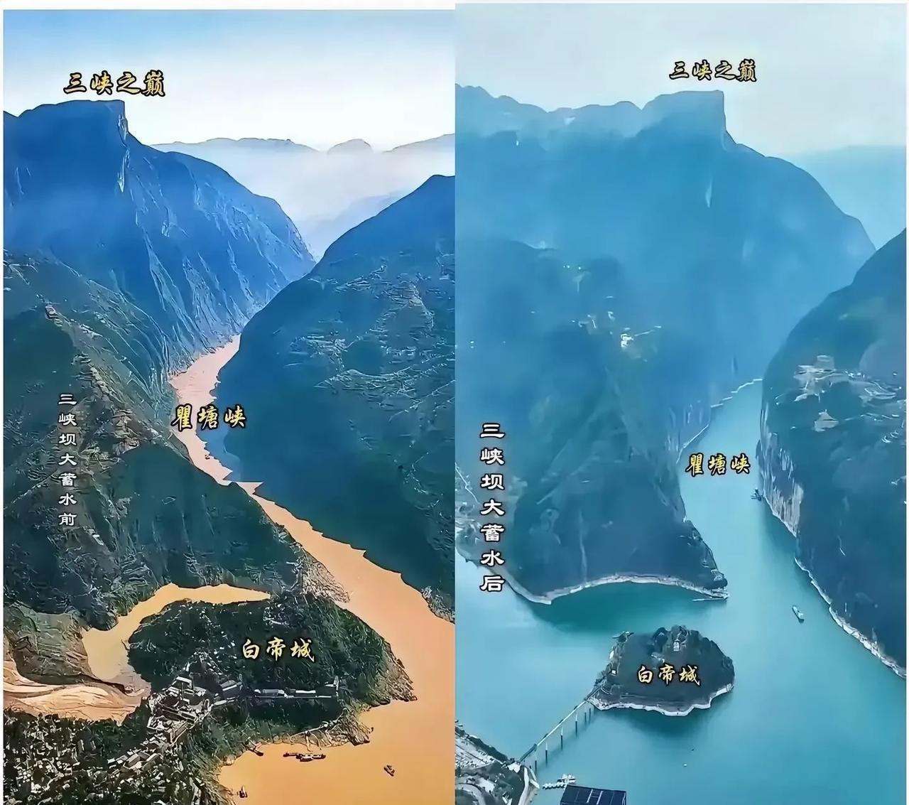 三峡蓄水前后对比 蓄水前的瞿塘峡,险峻奇绝,犹如天然屏障;蓄水后高峡出平湖,波澜壮阔更显恢弘! 白帝城依旧矗立,见证着时代与自然的交融。 这一组对比图,是否也让你感叹沧海桑田? 欢迎评论区聊聊你记忆中的三峡!