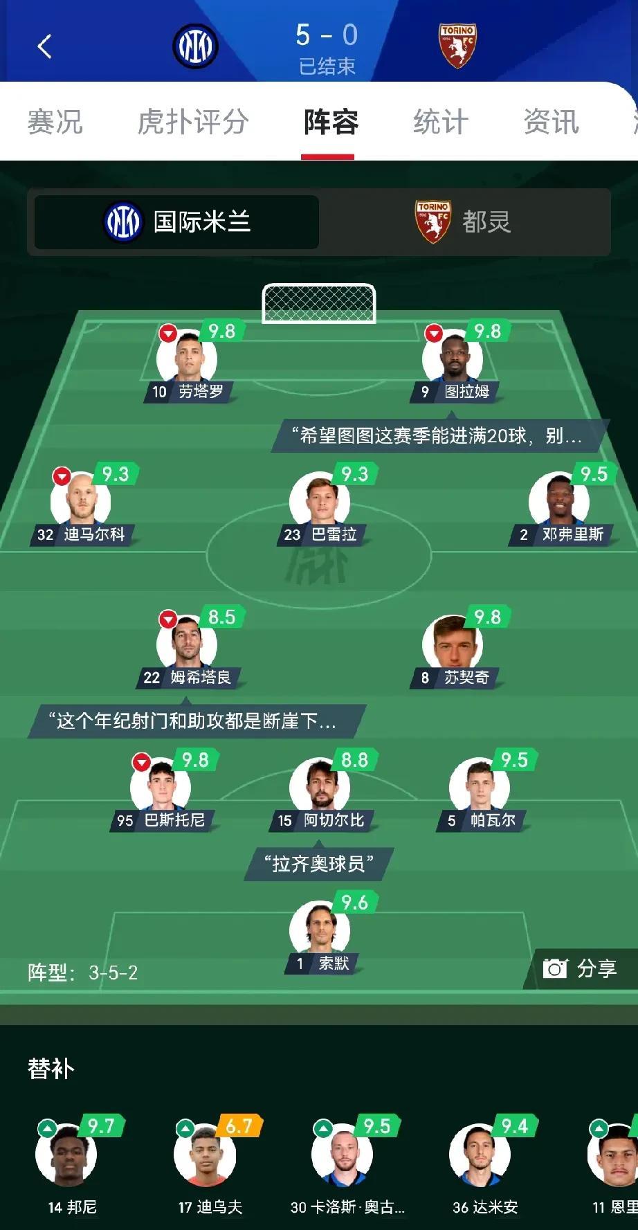 国米这赛季意甲冠军应该没跑了!第一场就这么酣畅淋漓,让我感觉有点不敢相信。 这赛季的国米让我感到陌生,攻击力比小因那支国米强多了,攻防转换速度是真快啊,终于不再是以前的老爷车了。而且板凳厚度也是好起来了,中场和前锋实力派的球员也不少。 这场巴雷拉后腰位置梳理的很好,两名新援有点东西,博尼首秀就进球,苏西奇妥妥的高级货。看来齐沃调教的不错。 今年意甲还是国米和那不勒斯二人转,其他球队依然没戏。