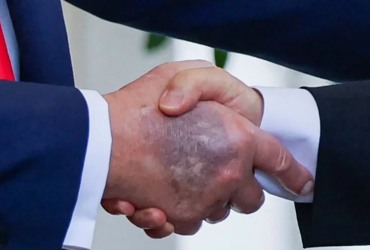 川普白宫会见李在明,手背乌青。 此前,白宫发言人莱维特表示,特朗普手部的瘀伤,则是特朗普握手过多而造成的。
