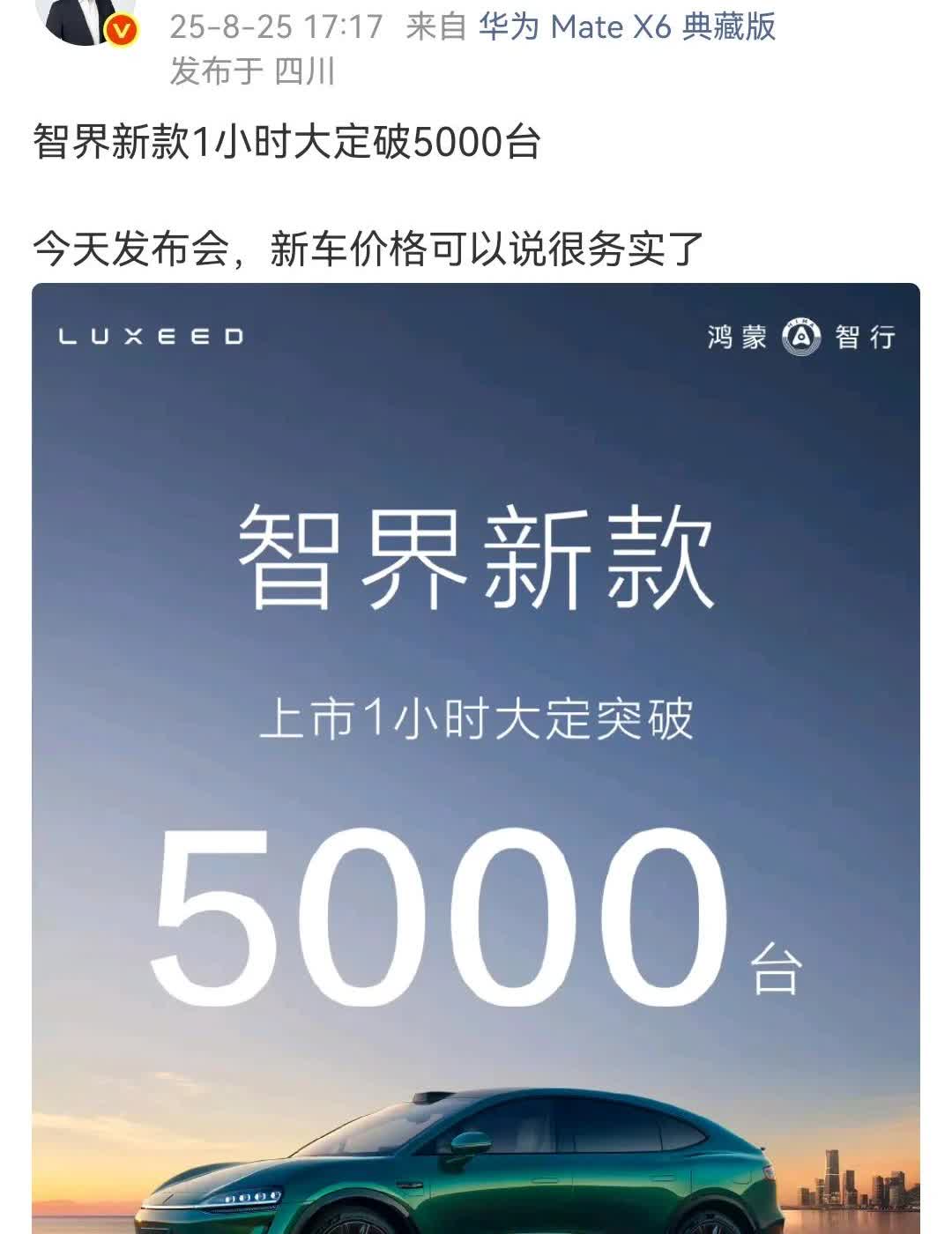 孙少军:智界新款1小时大定破5000台! 今天发布会新车价格可以说很务实了,这种大定还是比较正常的,毕竟首批订购的人都是想买车的人,成交率也非常的高。 预计24小时的预订数量也不会超过几万辆,毕竟买车的人总需求是在那里的,出现几十万辆被定出去的可能性几乎没有。 各位是怎么看的?欢迎评论区留言。
