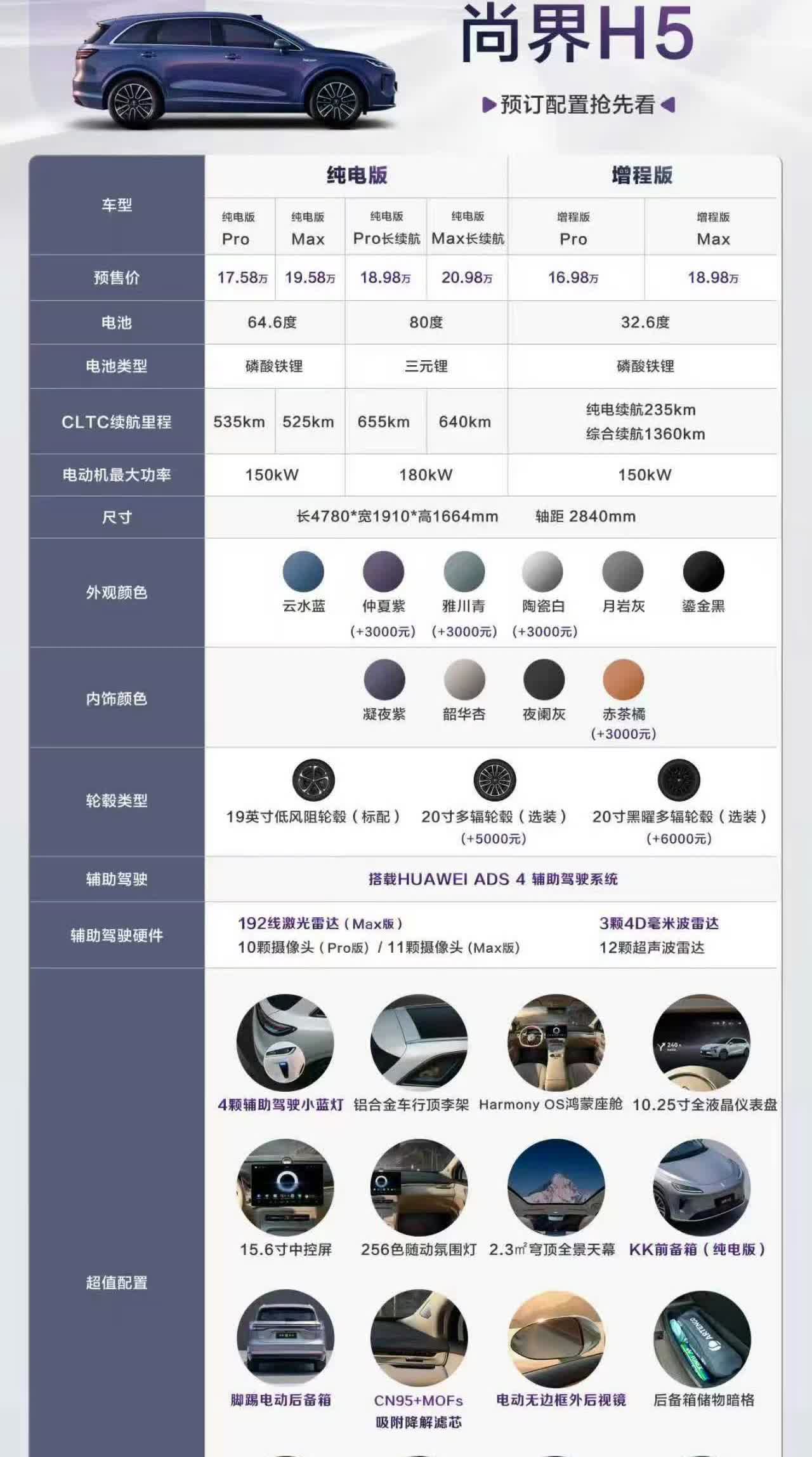 余承东还怪会玩呢 尚界H5放出来配置,下面竟然还有隐藏彩蛋,小订超过5万辆有1000元的权益,小订超过10万辆有两千元的权益,小订超过15万有3000的权益,也不知道那个营销高手出的主意 看了一下,带激光雷达的版本最低也得19万,但是最贵的也不过20.98万,这个价格虽然很有诱惑力,但是几乎与问界M5重叠了 不过尚界H5的激光雷达版本配置也不低,不仅有192线程激光雷达,还有3颗4D毫米波雷达 不过,尚界H5的价格区间也就是15-20万左右,只不过多了1万,预售价为16-20