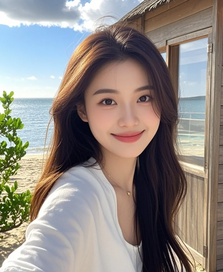 晚风中的沙滩倩影,长发飘散,笑容温柔,神秘浪漫