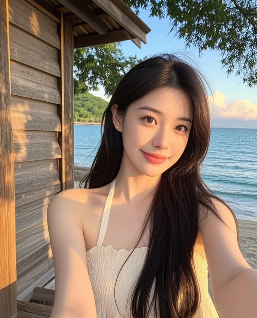 晚风中的沙滩倩影,长发飘散,笑容温柔,神秘浪漫