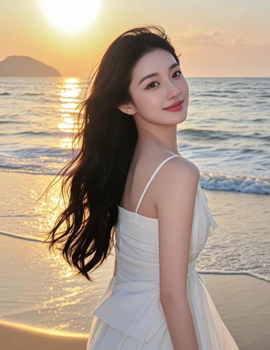 长发与海浪共舞,她回眸浅笑,尽显大牌风范与东方魅力