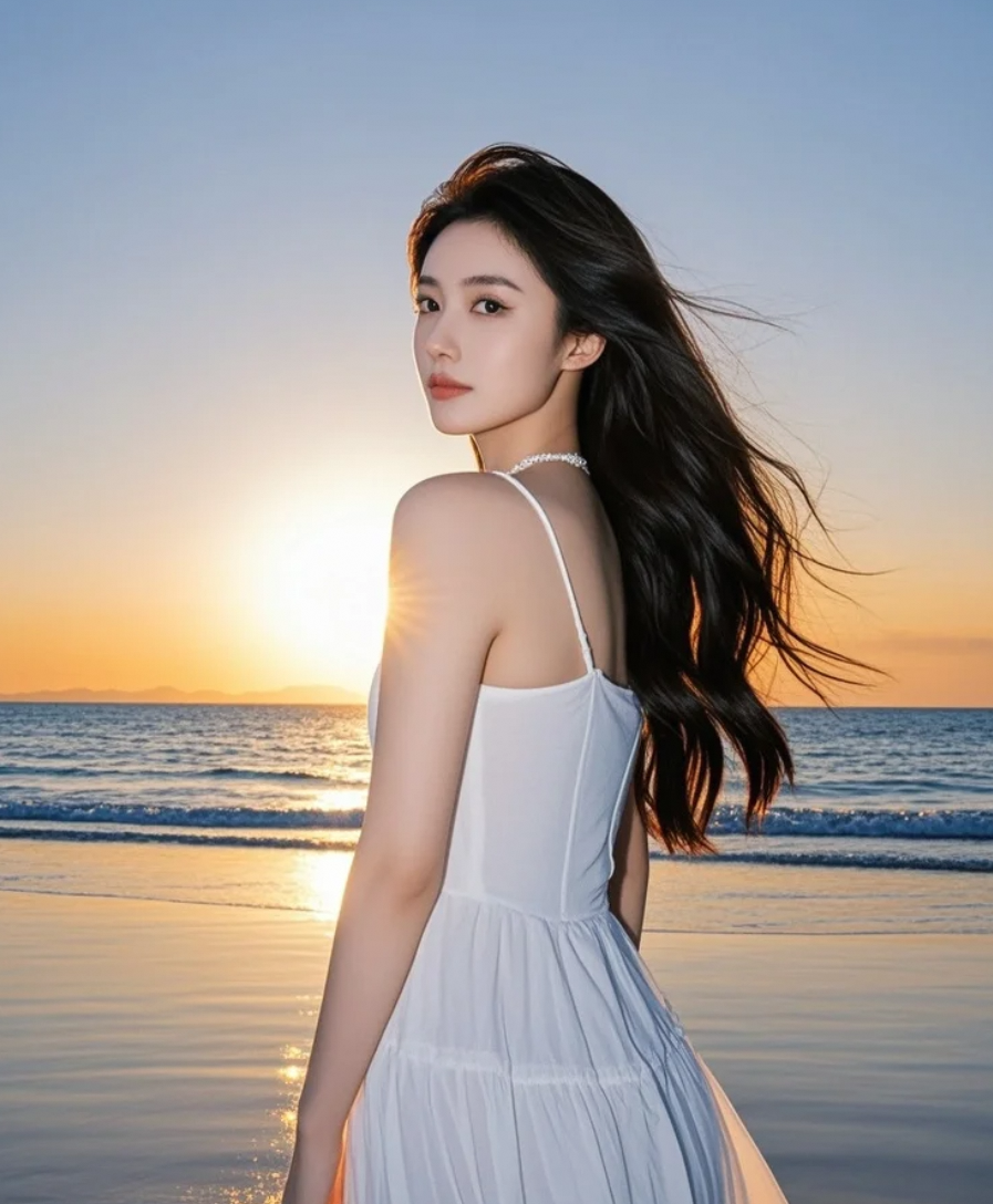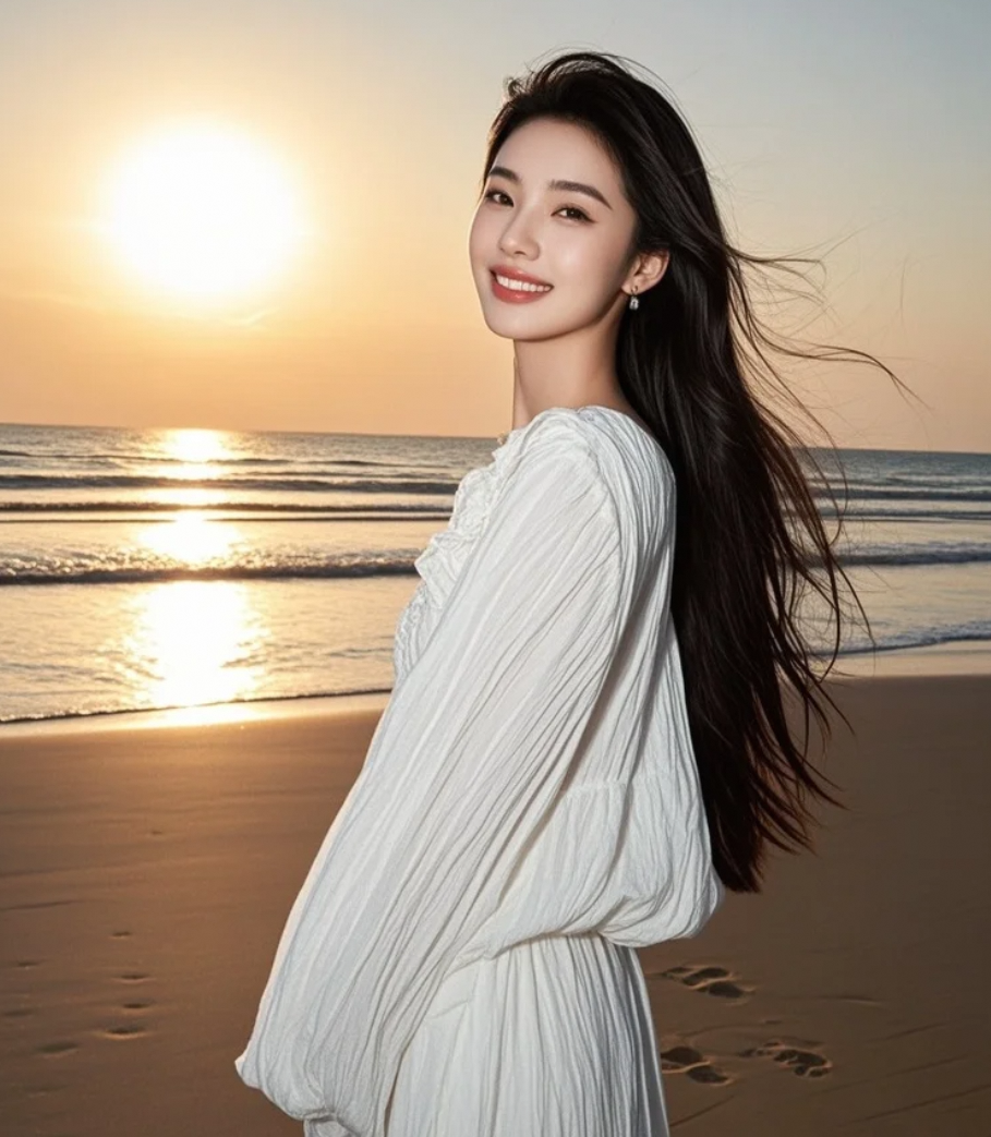 晚风轻送,沙滩上的长发女神,温柔笑意定格永恒瞬间