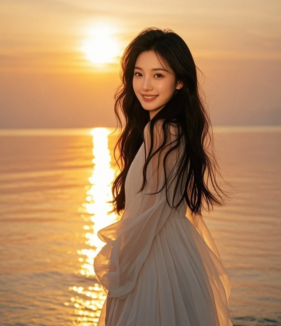夕阳熔金,她伫立海岸,长发飘飘,笑容温柔如暖阳