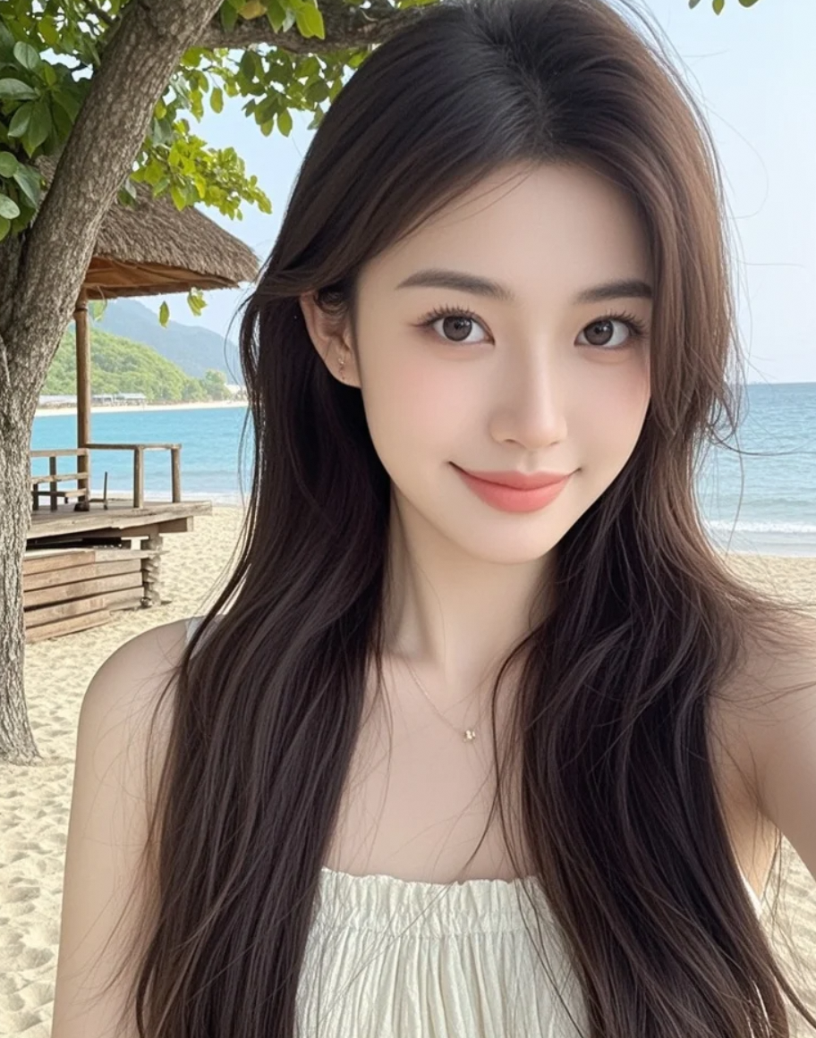 长发在金色沙滩上飞扬,温柔的笑容令人心醉