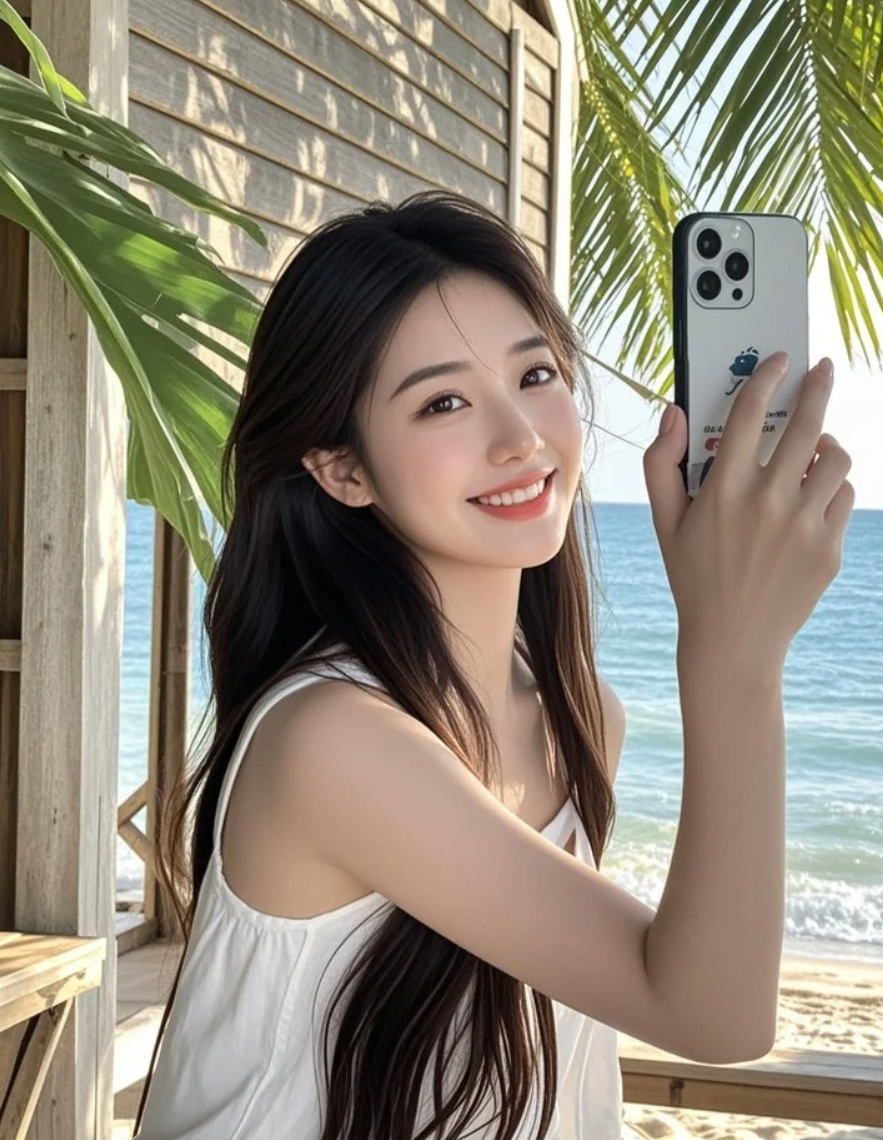 长发与海浪共舞,她回眸浅笑,尽显东方巨星魅力
