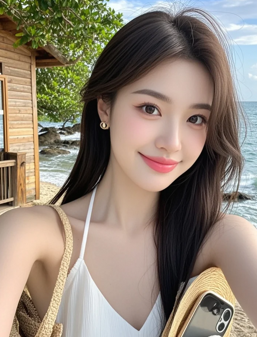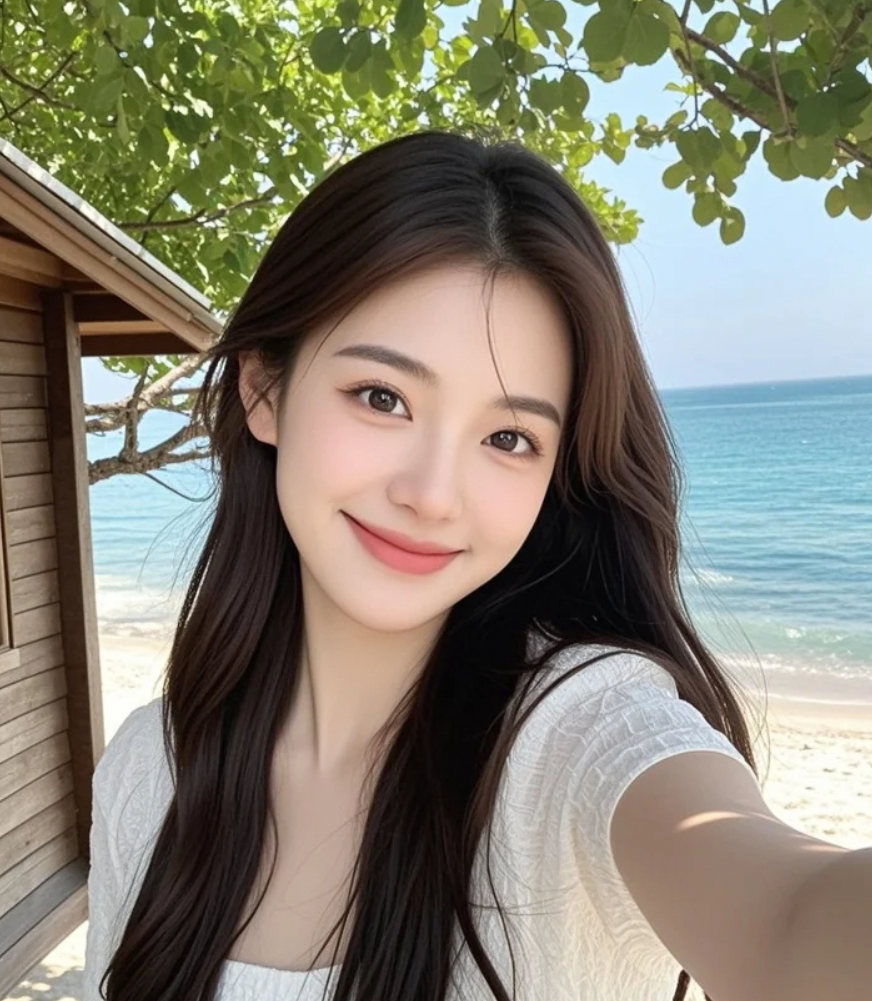 晚风中的沙滩倩影,长发飘散,笑容温柔,神秘浪漫