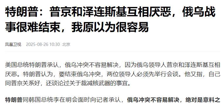 特朗普说,他近日与普京通话时发现,俄罗斯总统对乌克兰总统泽连斯基的个人反感,是阻碍两人会面的关键因素。“他不喜欢他,我也有些人不喜欢,我也不想和他们见面。” 之后,特朗普在跟韩国总统李在明见面,又接着说俄乌会面的事儿。这次他说得更直白,说最终到底见不见,还得乌克兰和俄罗斯自己拿主意。他还顺口说了句常挂在嘴边的话:“跳探戈得两个人愿意才行”,意思就是光一方想谈没用,俄乌两边都得有这个心思才行。 这两番话一出来,谁都能看明白,特朗普对促成俄乌和平协议这事儿,已经有点“麻了”。之前他可能觉得自己本事大,能轻松把两边拉到谈判桌前,可真上手才发现,这里面的门道比他想的复杂多了,根本不是他当初以为的那么简单。 之前特朗普可不是这态度,那时候他信心满满,总说自己能快速让普京和泽连斯基见面,早点把俄乌的仗停下来。现在却主动说普京不喜欢泽连斯基,这态度的转变,明摆着是事情没按他的预期走,推进得特别不顺利。 外界看了都在猜,特朗普之前说不定太把自己当回事,高估了自己在俄乌局势里能起到的作用。 而且俄罗斯那边也有动静,外长拉夫罗夫之前也提过,普京其实不是不愿意跟泽连斯基见面,但前提是得先把会面的议程好好准备好,得有合理的安排才行。 这话听着像是给会面留了口子,可实际上又把难题抛给了乌克兰,要是乌克兰这边给不出让俄罗斯满意的议程,会面照样没下文。 现在也没人知道,泽连斯基能不能顺着这个话茬,给出让俄方点头的回应。要是两边总在这些前期准备上磨磨唧唧、谈不拢,那见面这事儿估计还得一直拖下去。 特朗普之前还提过一嘴,说美国可能一两周后会介入俄乌局势。这话没人能摸透真实意思,是想借着美国介入给俄乌两边施压,逼他们赶紧见面谈?还是想通过介入,让美国在之后的俄乌谈判里多占点好处?反正现在谁也说不准他到底打什么算盘。 现在特朗普的处境其实挺尴尬的。他本来想靠着促成普泽会面,显显自己的能耐,可俄罗斯有俄罗斯的想法,乌克兰有乌克兰的立场,两边都不完全听他的。他既没法硬按着两边的头让他们坐下来谈,又不能眼睁睁看着自己推进的和平事儿就这么黄了。 接下来特朗普能不能找到法子打破这个僵局,让俄乌局势往和平的方向走,现在看来还真不好说,只能再等等看后续的动静。