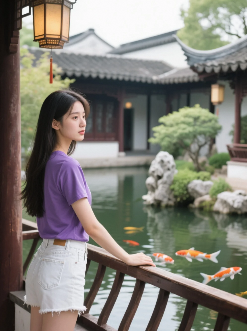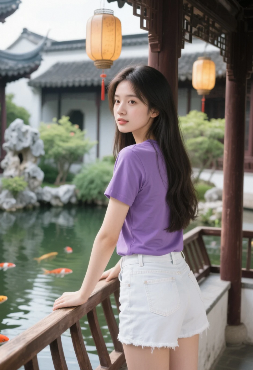 紫衫轻扬,白裤映水,她在古亭中写下一首今夕诗