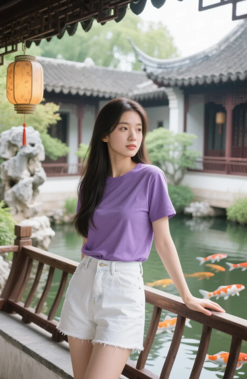 凉亭深处,木栏微旧,她的身影却让岁月焕了新颜