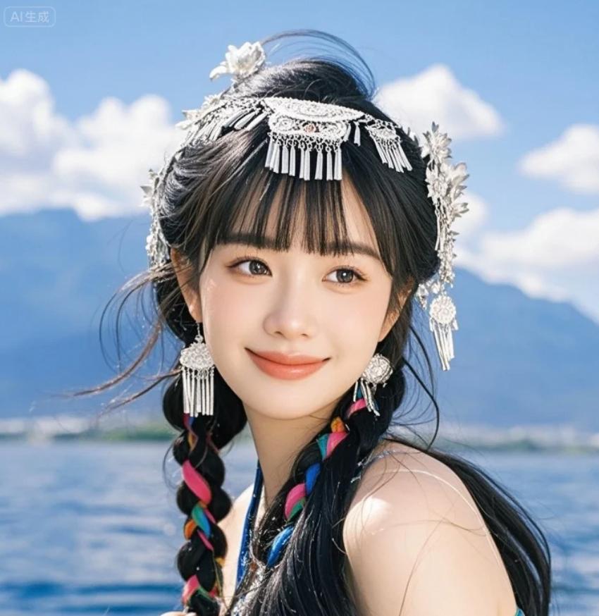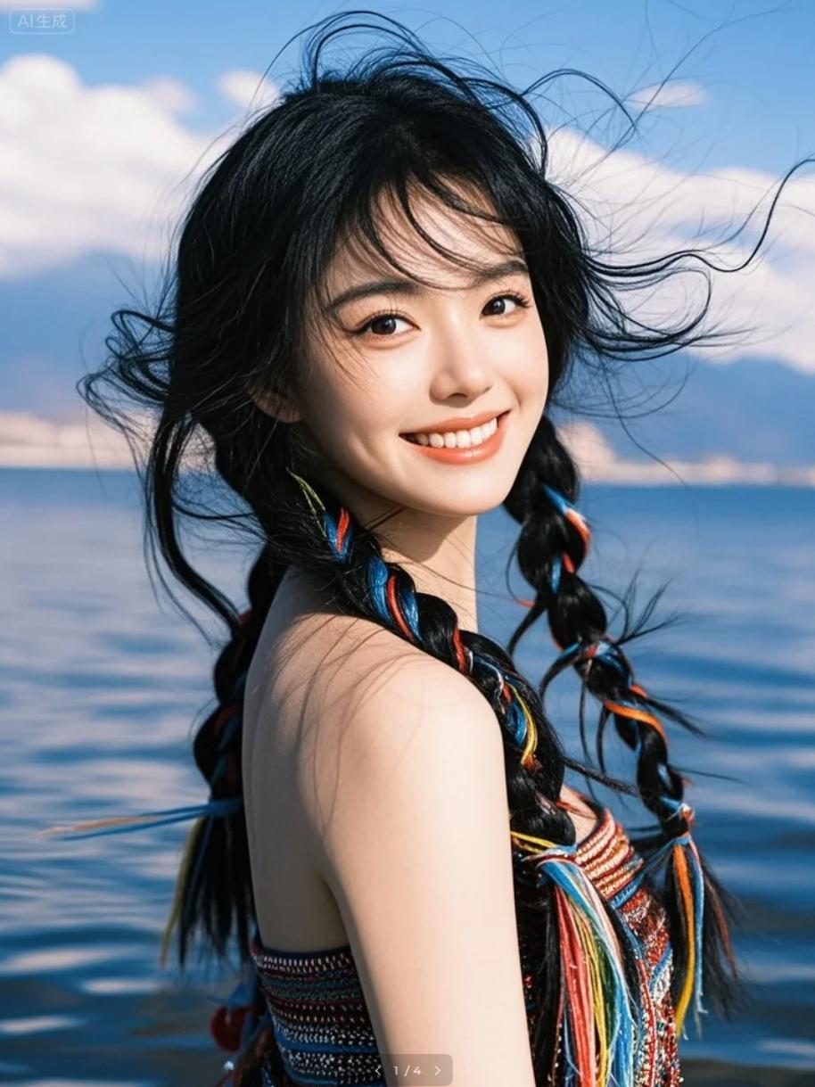 湖畔边的双麻花辫,倒影讲述着她的故事