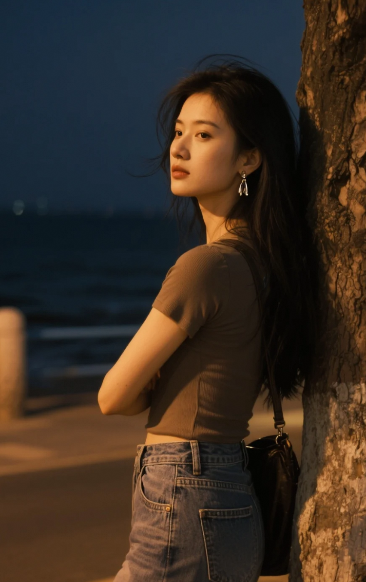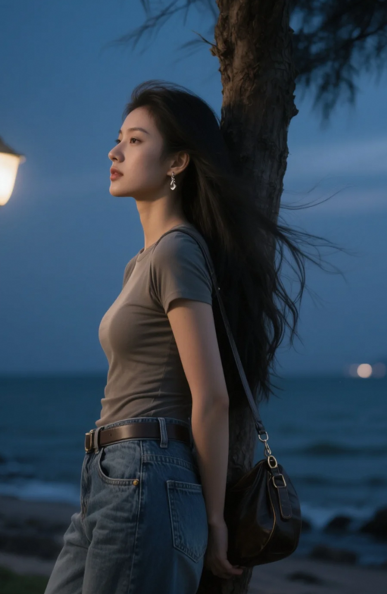 海边的路灯太懂浪漫,把她的侧脸照得像旧胶片