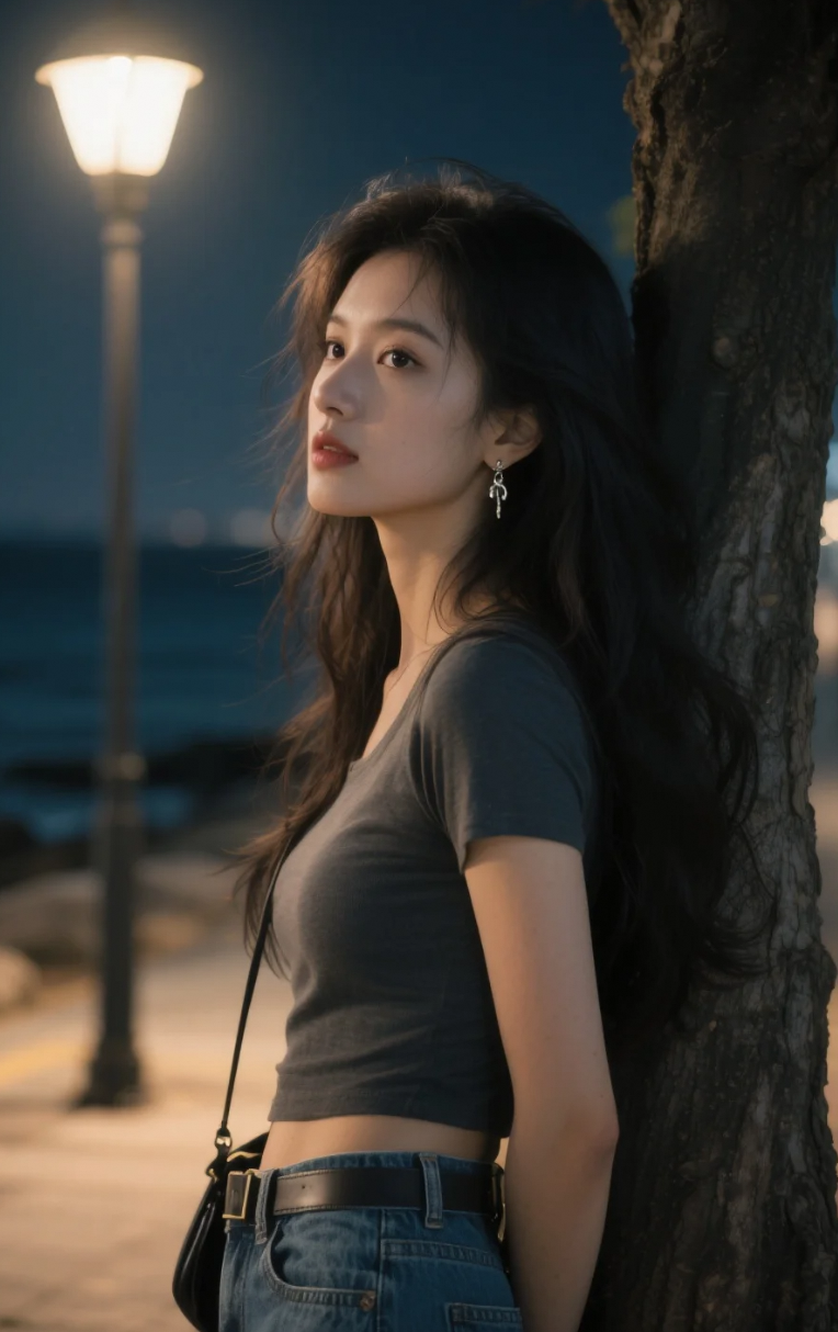 海边的路灯太懂浪漫,把她的侧脸照得像旧胶片