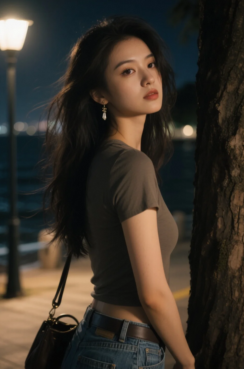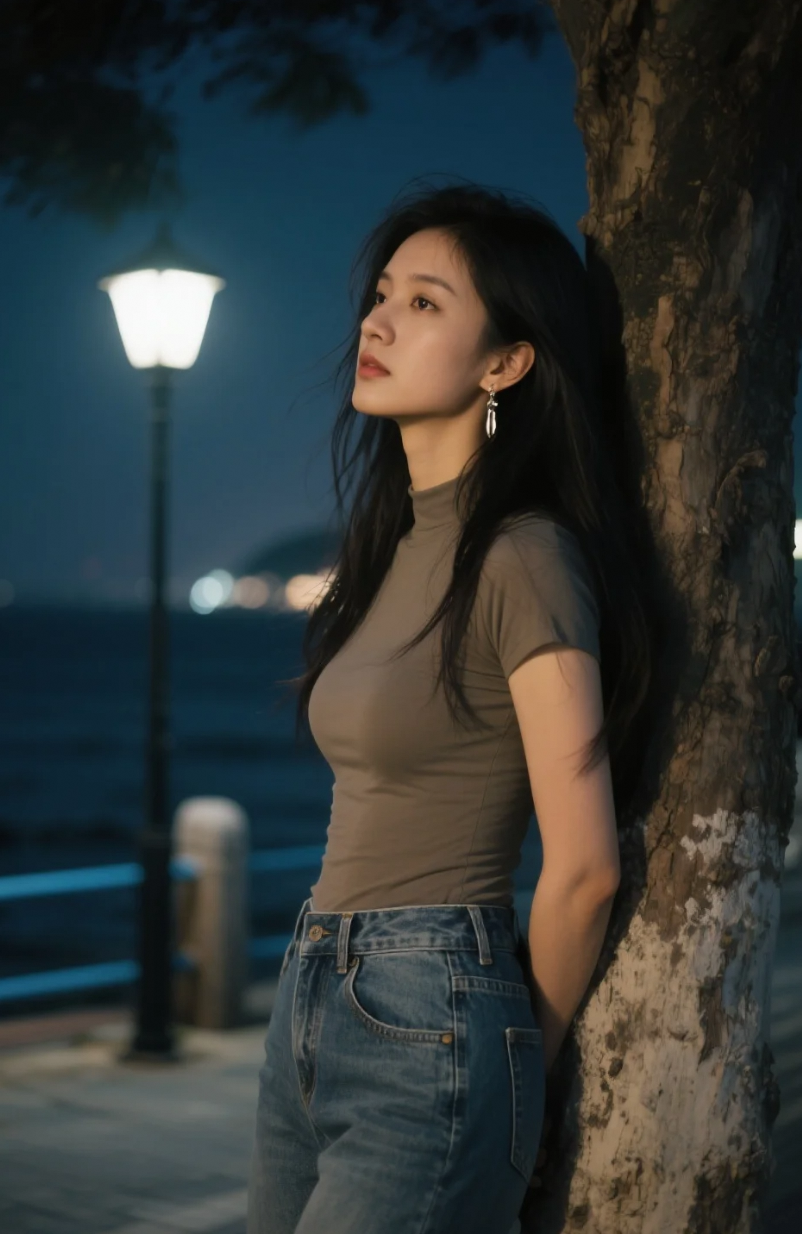 海边的路灯太懂浪漫,把她的侧脸照得像旧胶片