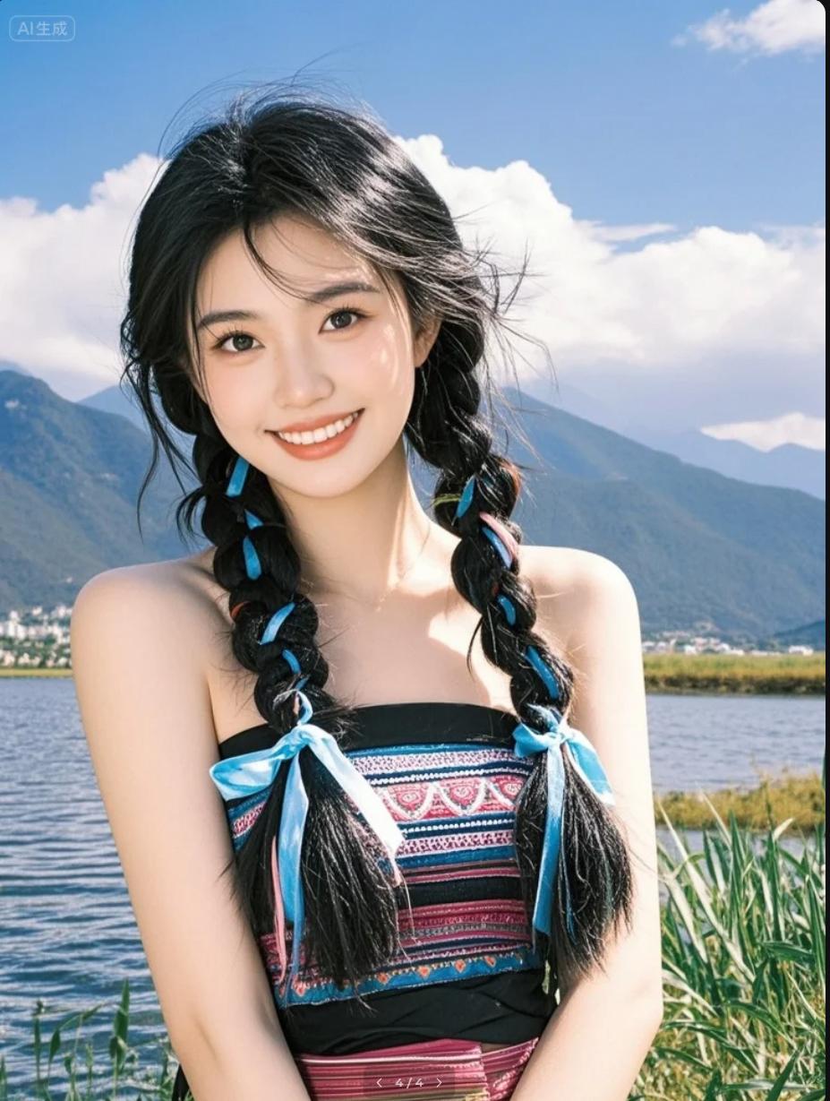 少女将一束彩色麻花辫甩向湖面:“看,我把彩虹丢进水里啦!”