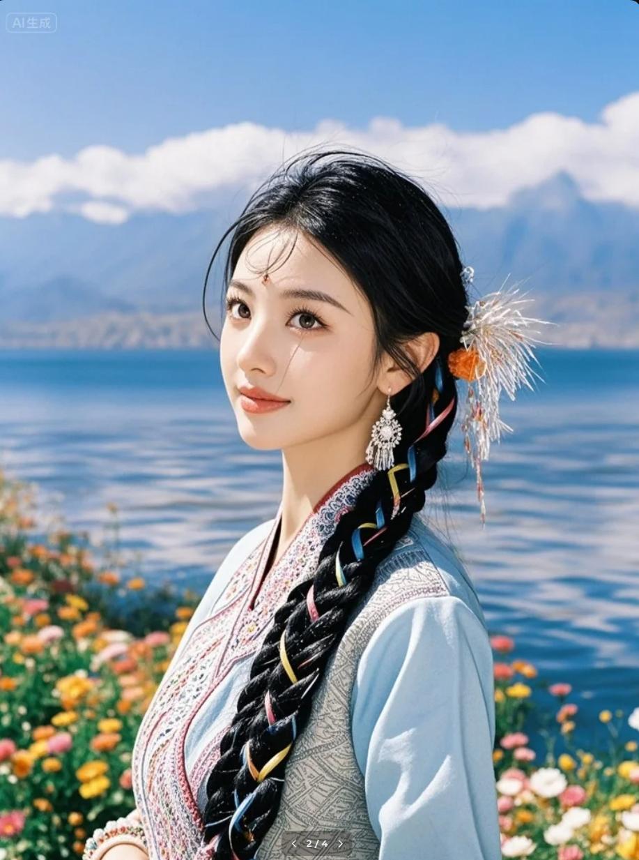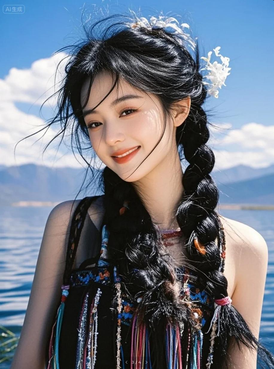 少女将一束彩色麻花辫甩向湖面:“看,我把彩虹丢进水里啦!”