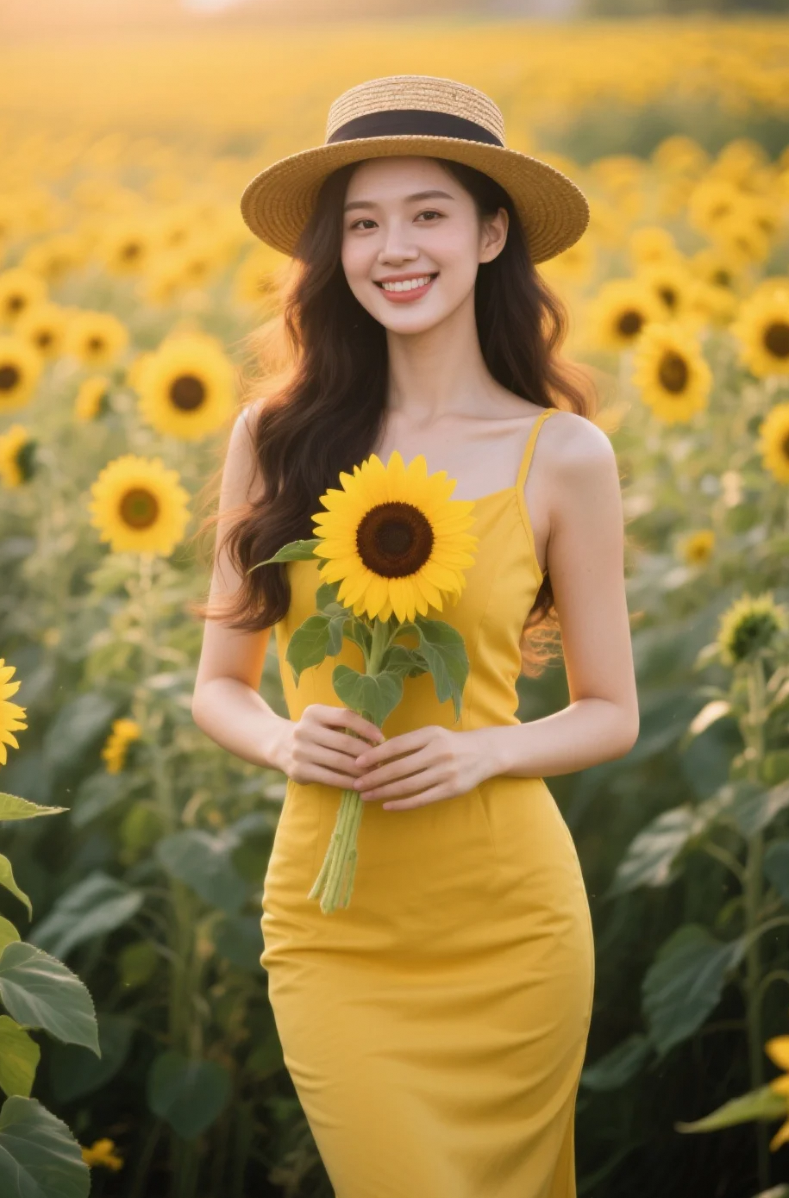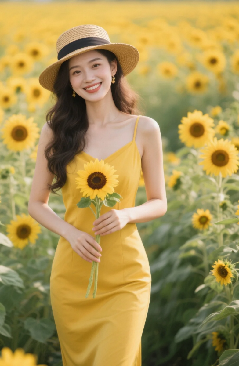 黄裙与向日葵同频摇曳,她是夏日最温柔的光源